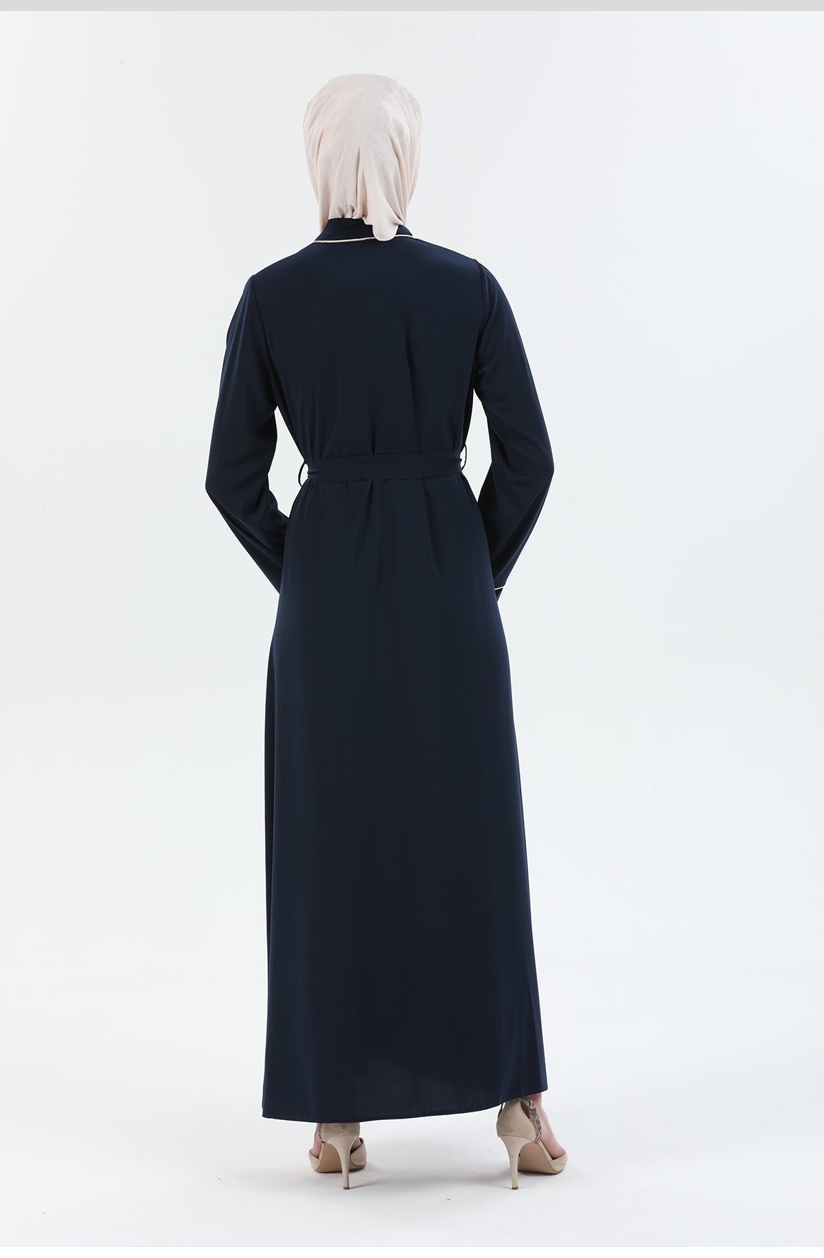 توجد تفاصيل على شكل خطوط على السحّاب والمعصمين. يوجد تطريزعلى شكل خطوط على طول السحاب والأكمام ذراعيه مستقيمتان. لديها سحاب أمامي. حزام . الجيب متاح. لون المنتج هو بالضبط كما في الصورة.