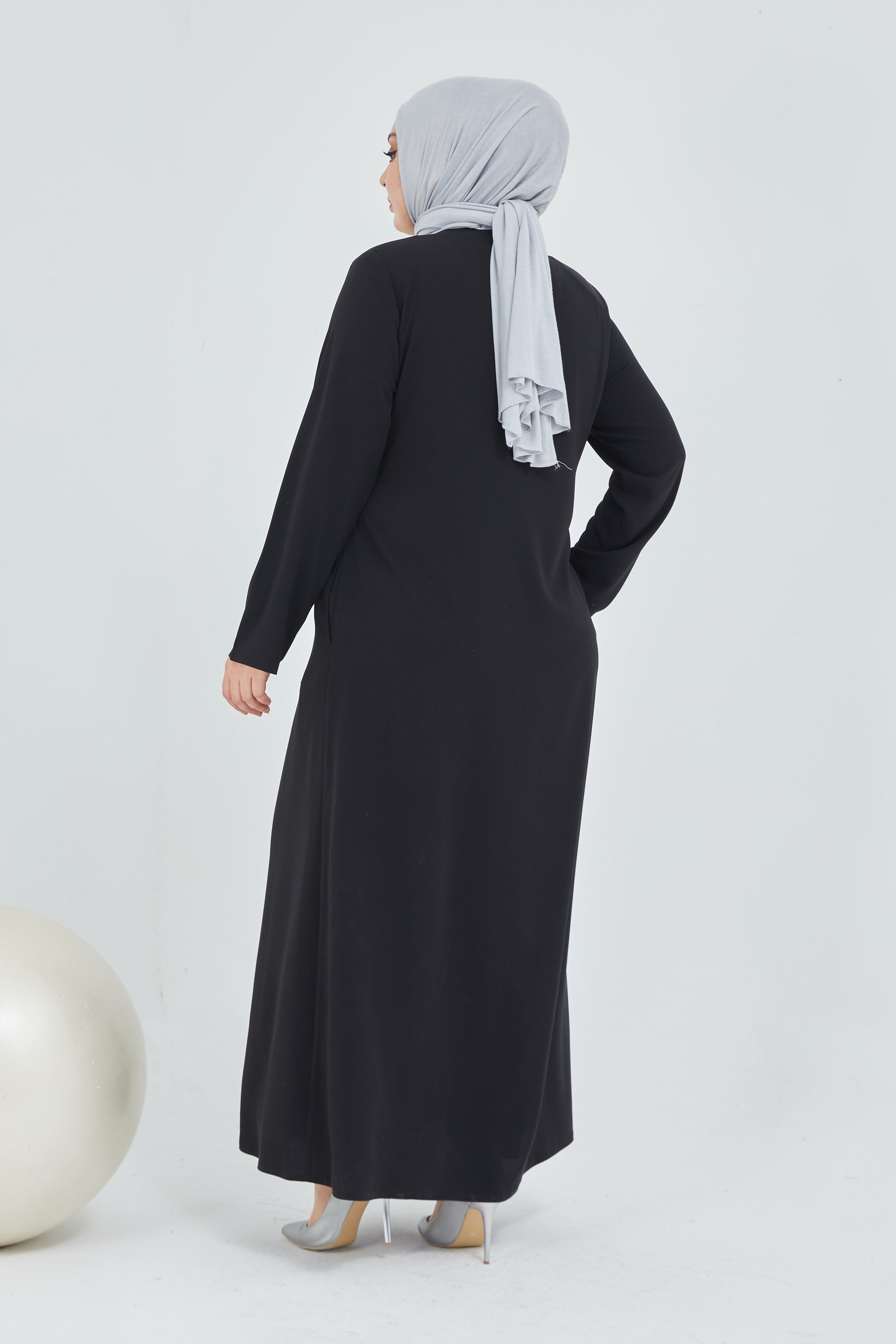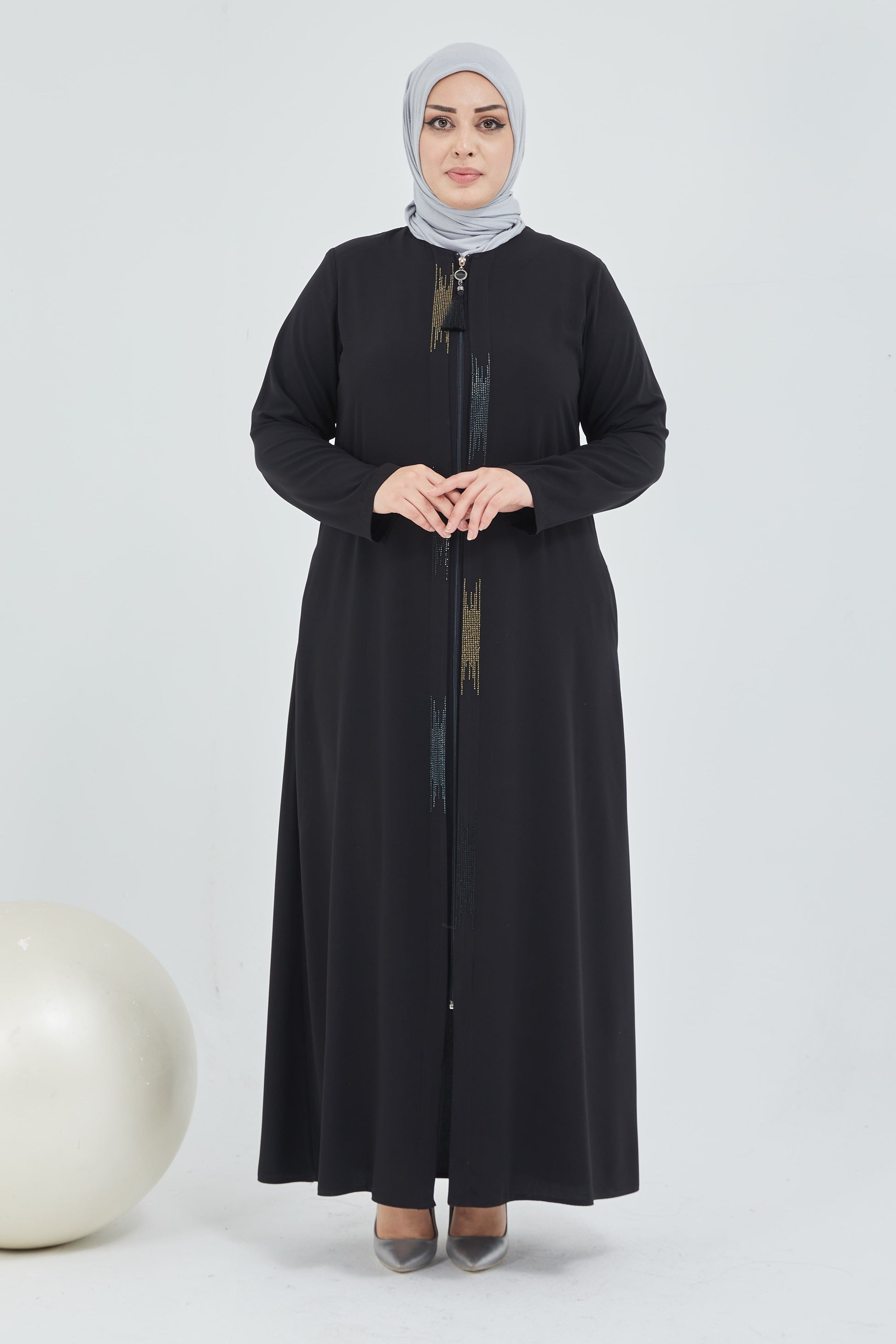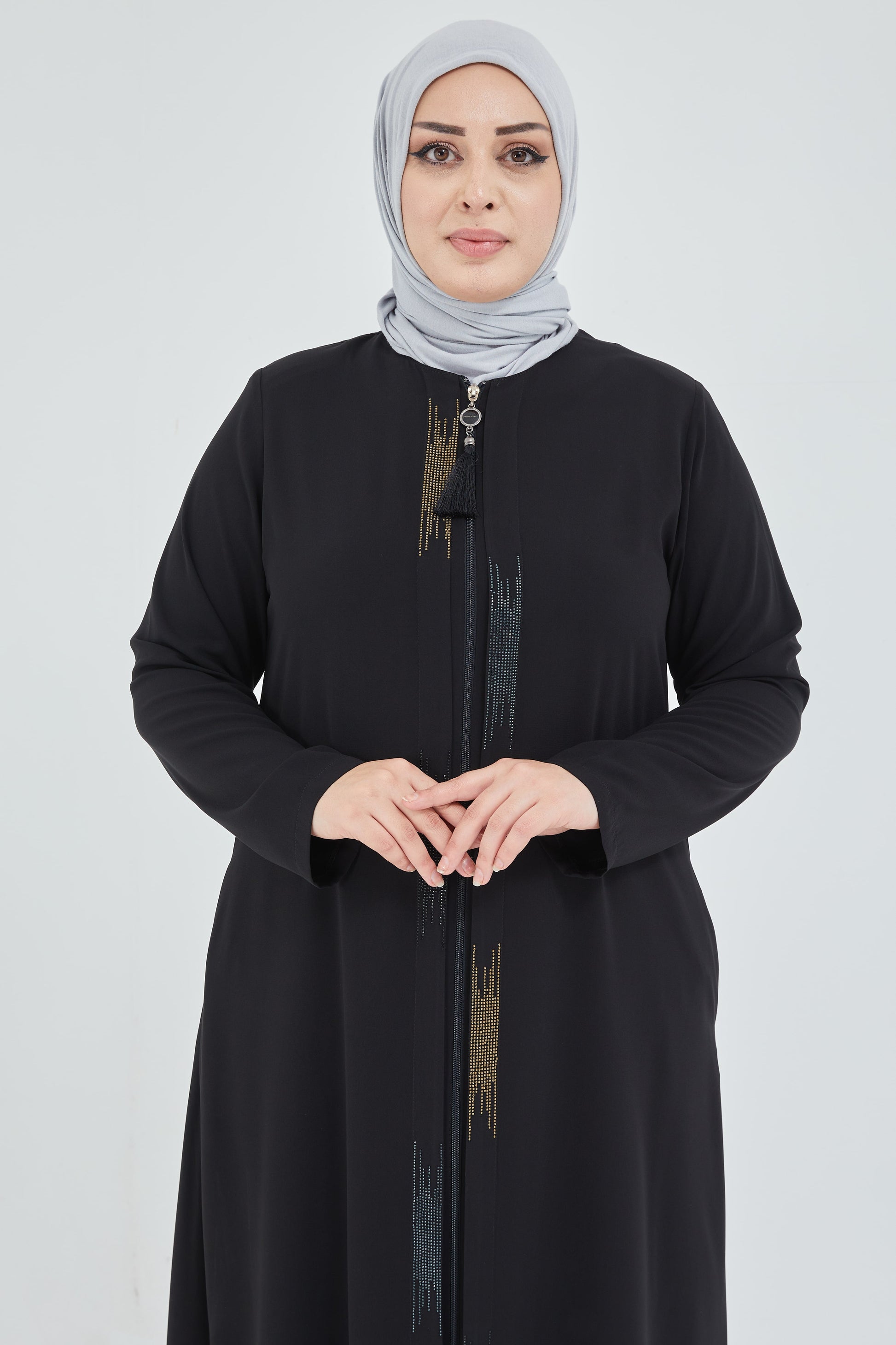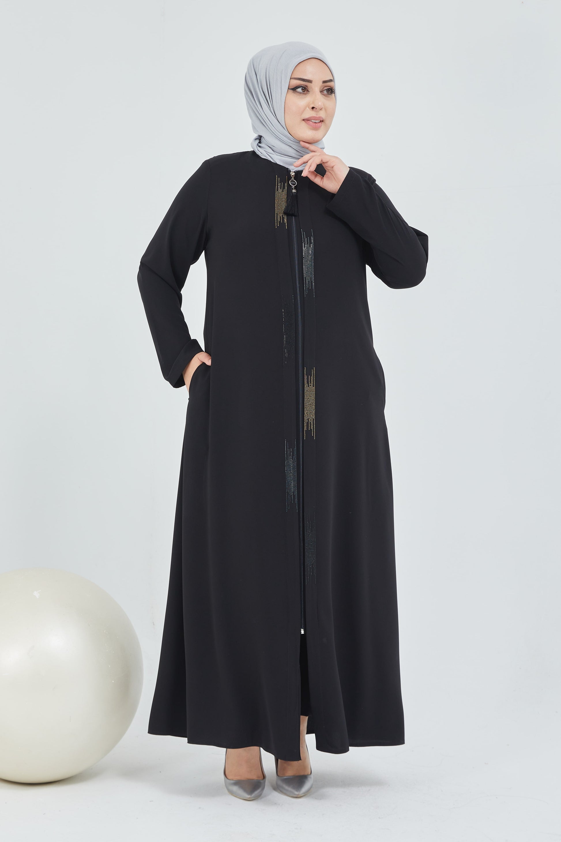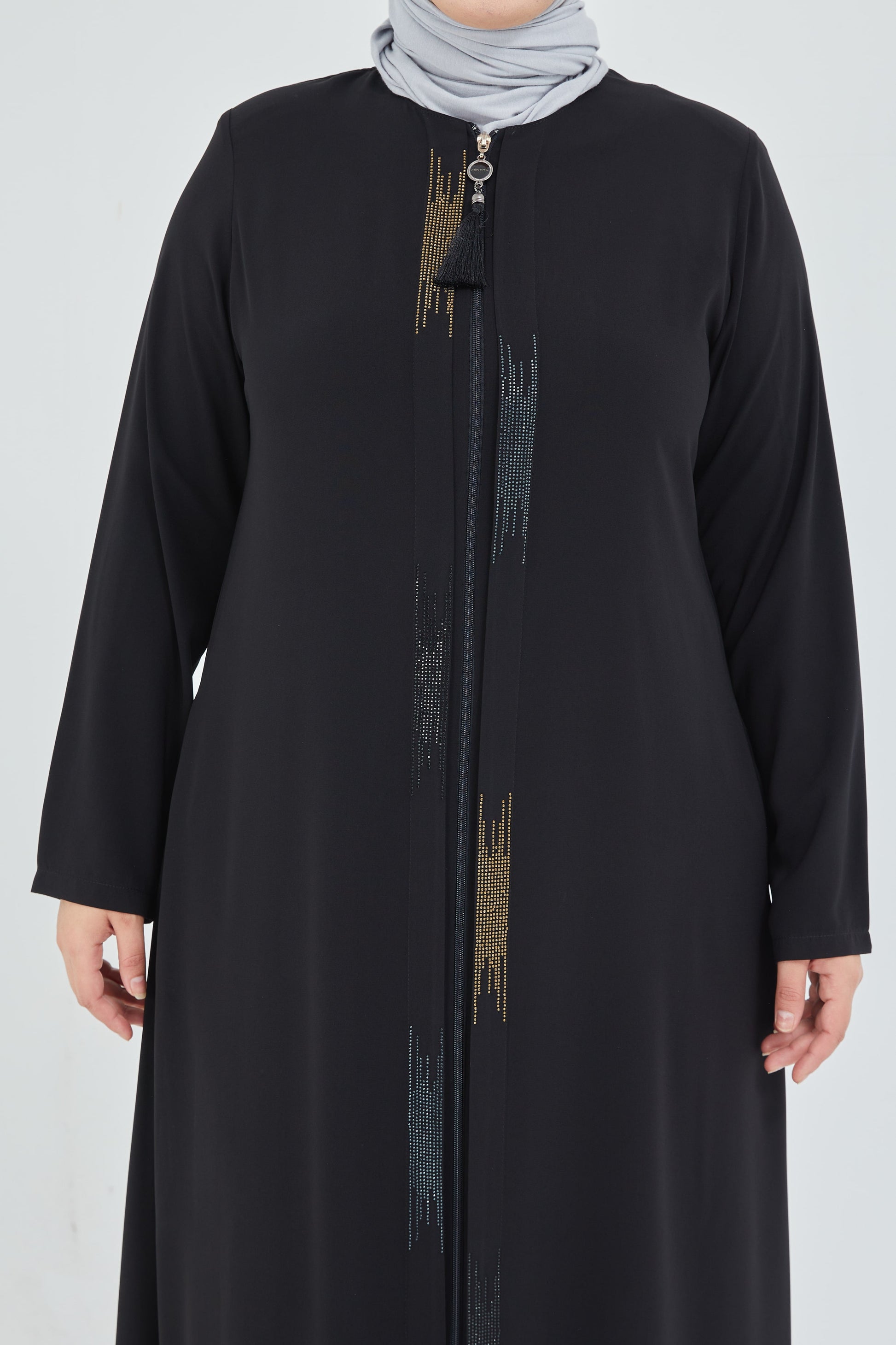 عباية سوداء مقاس كبير مزينة بالحجر مع فتحة مزدوجة من الأمام | 2066-1