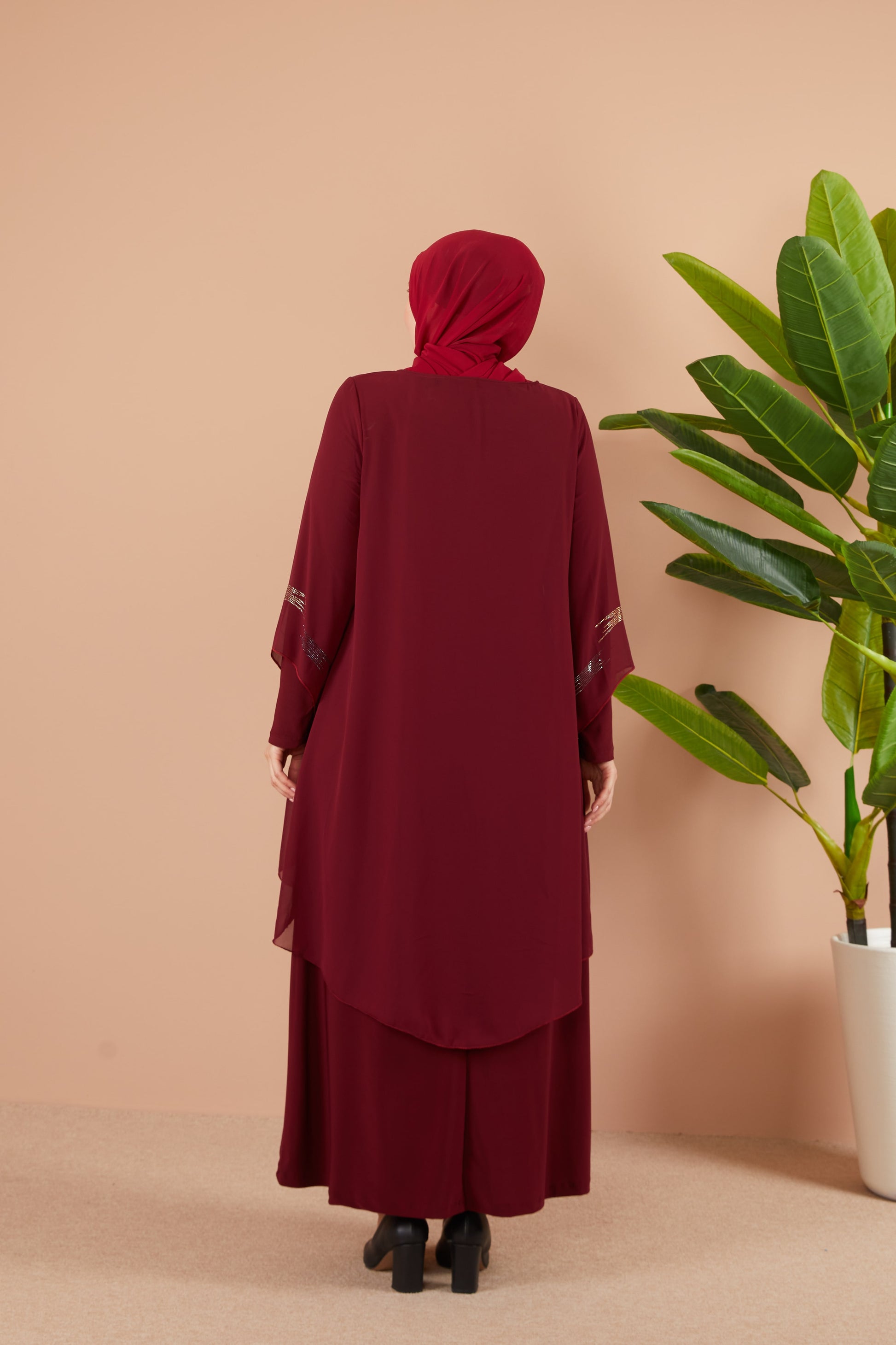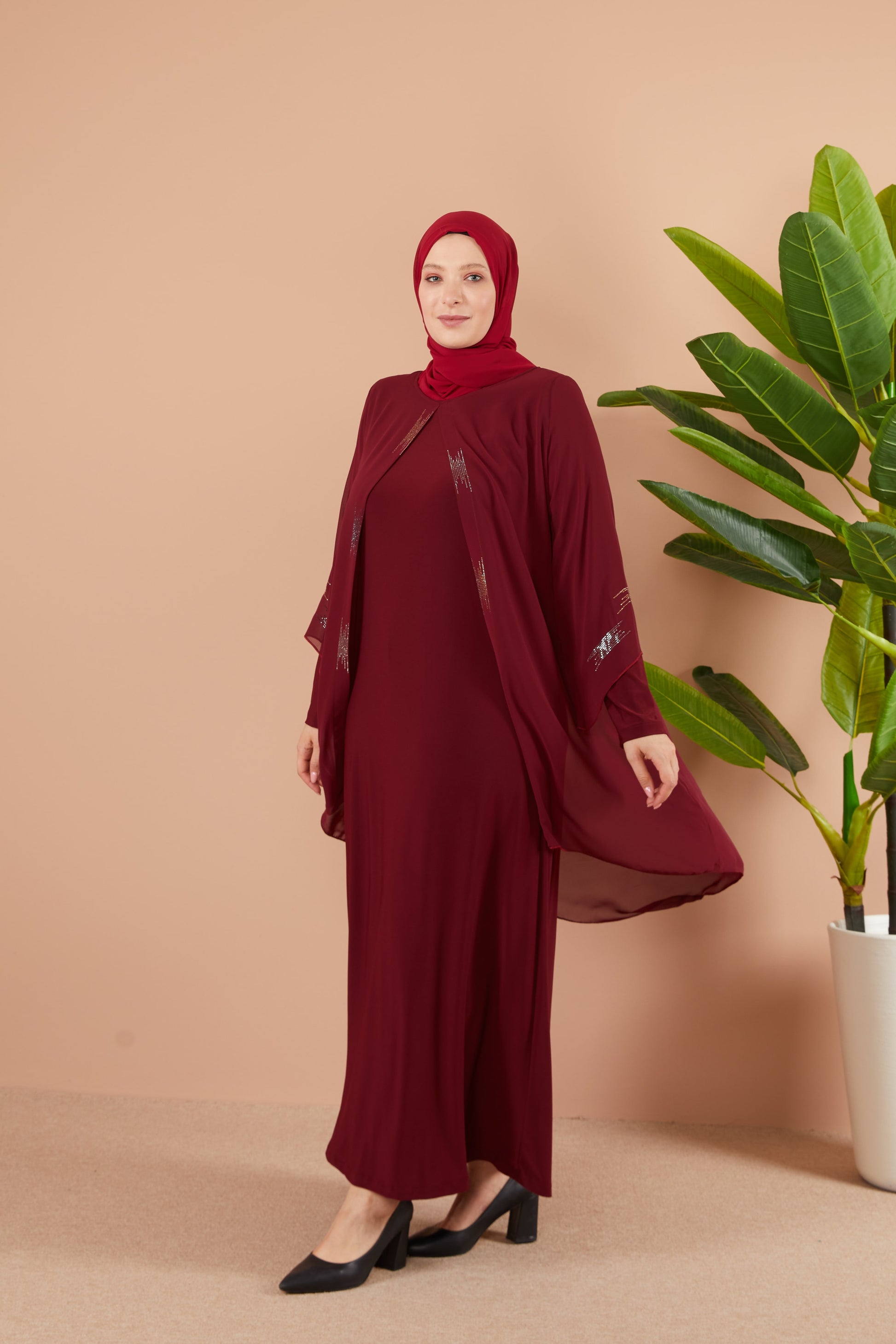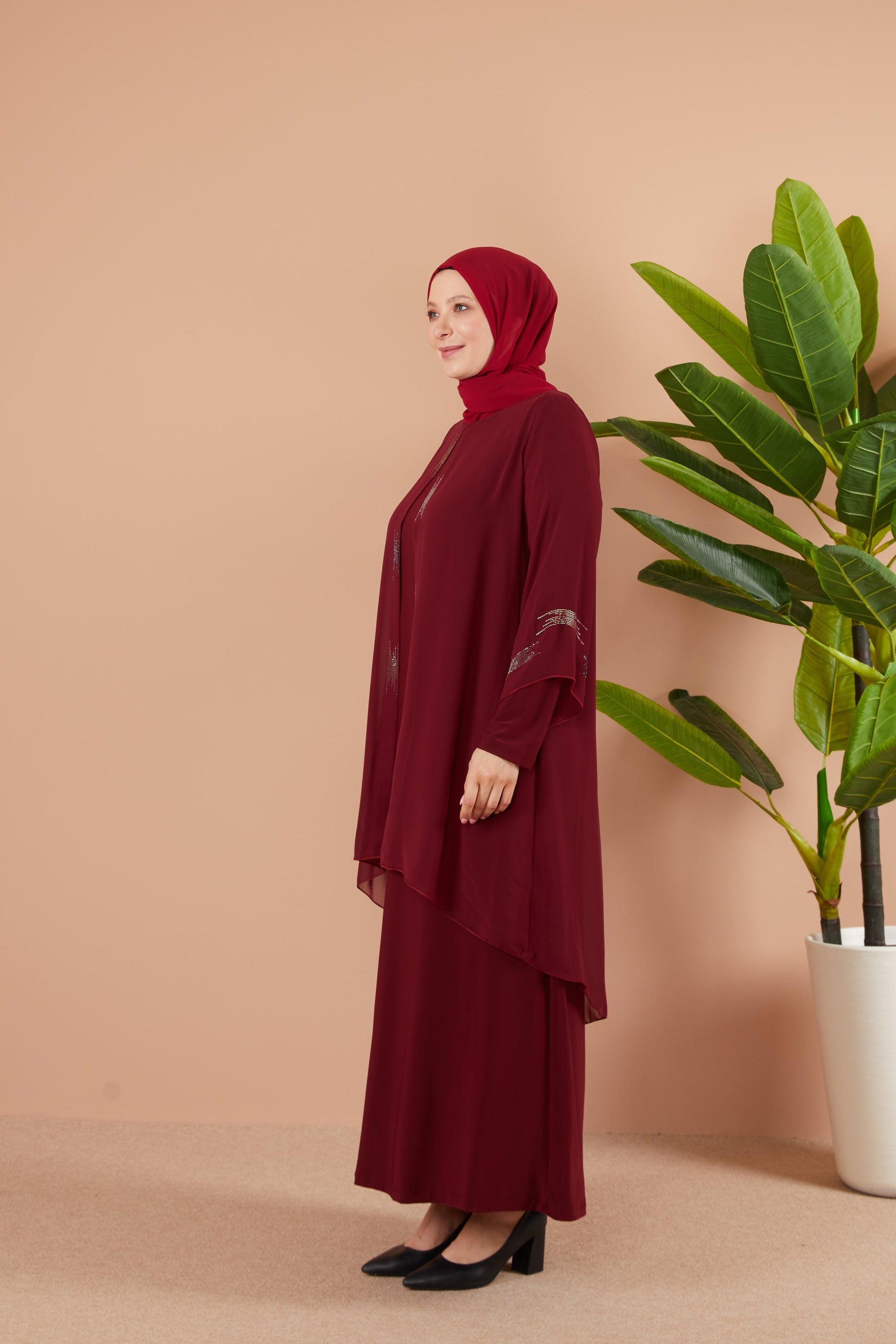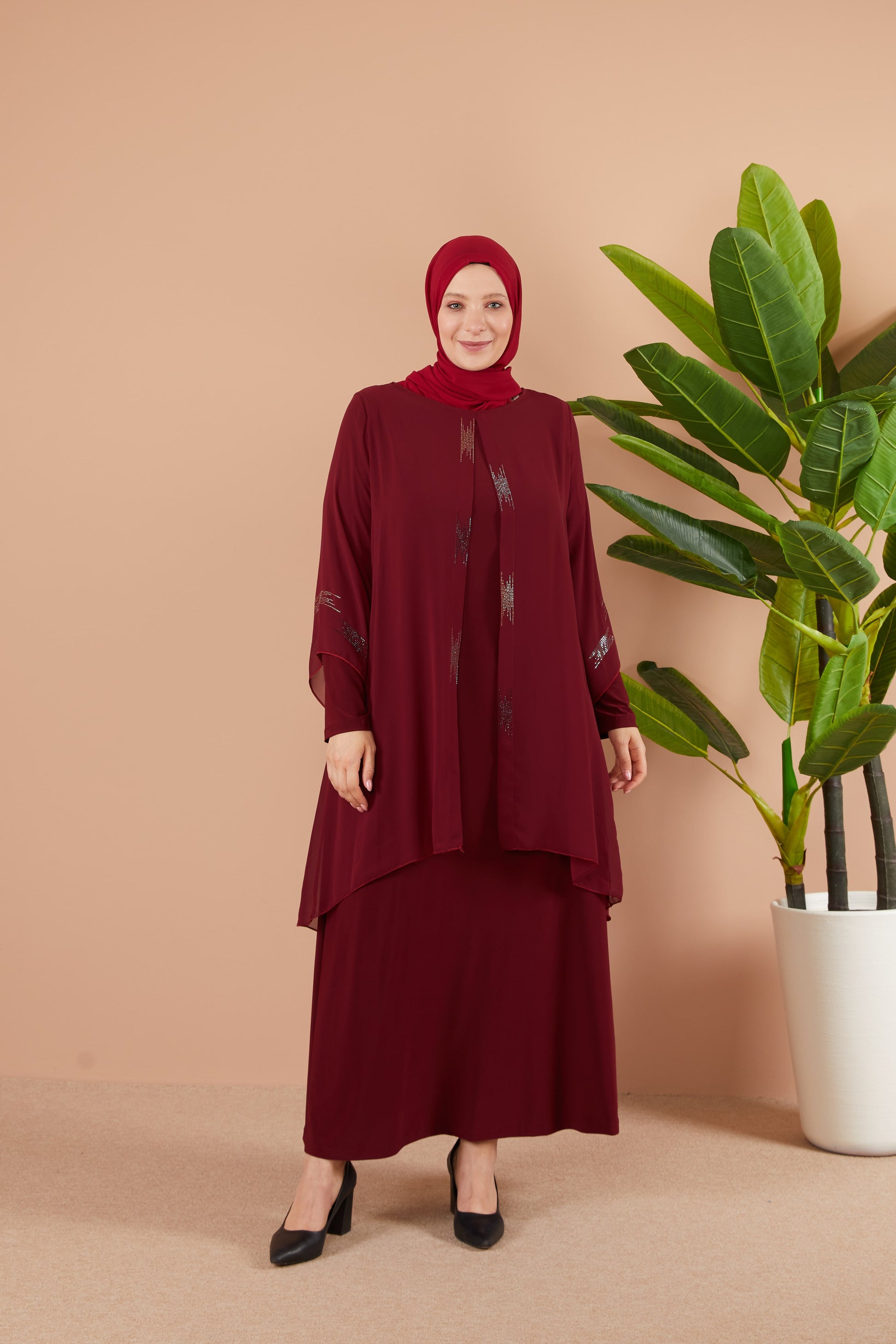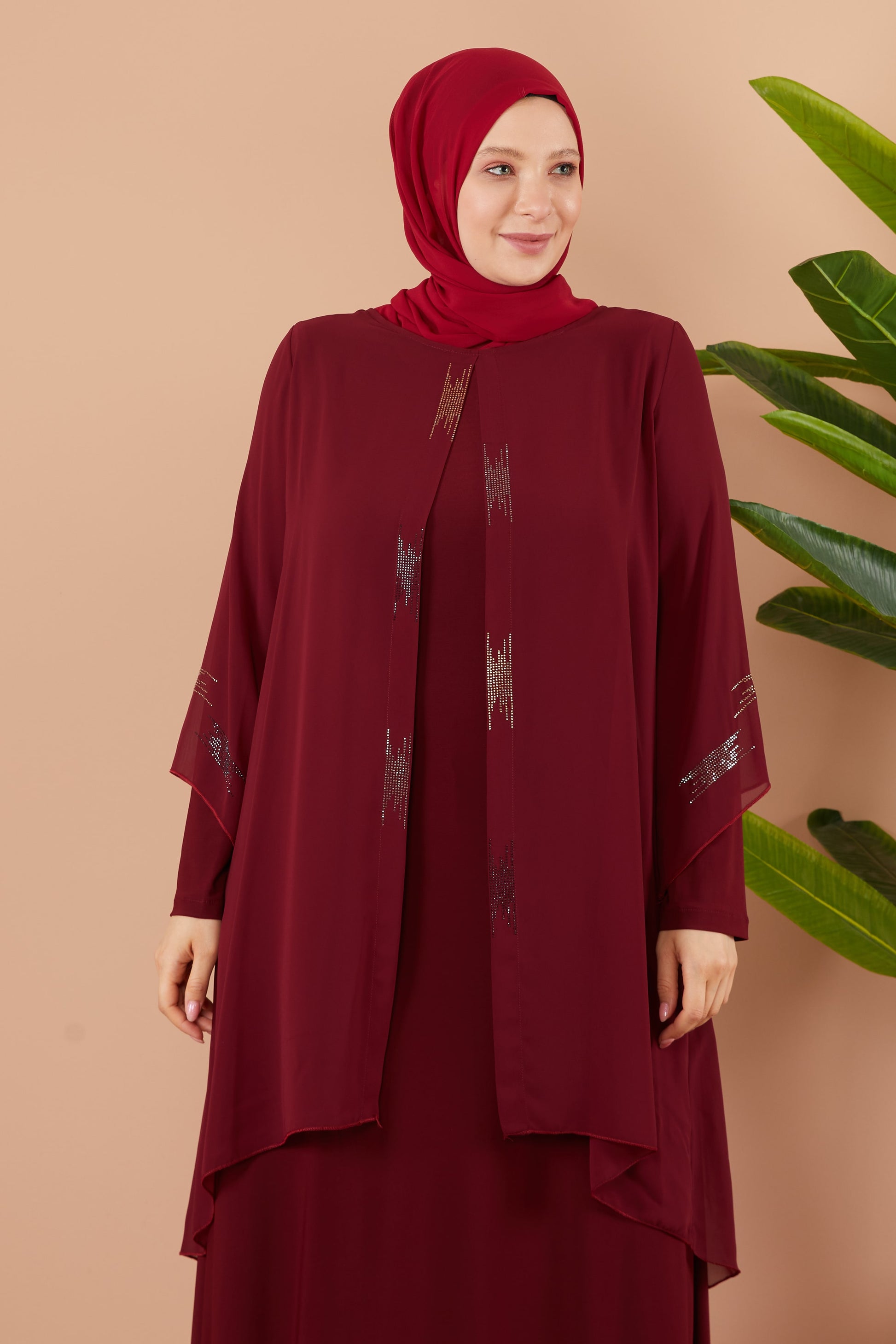 Önü ve Arkası Şifonlu Taş Detaylı Büyük Beden Sendi Elbise Bordo | 801317
