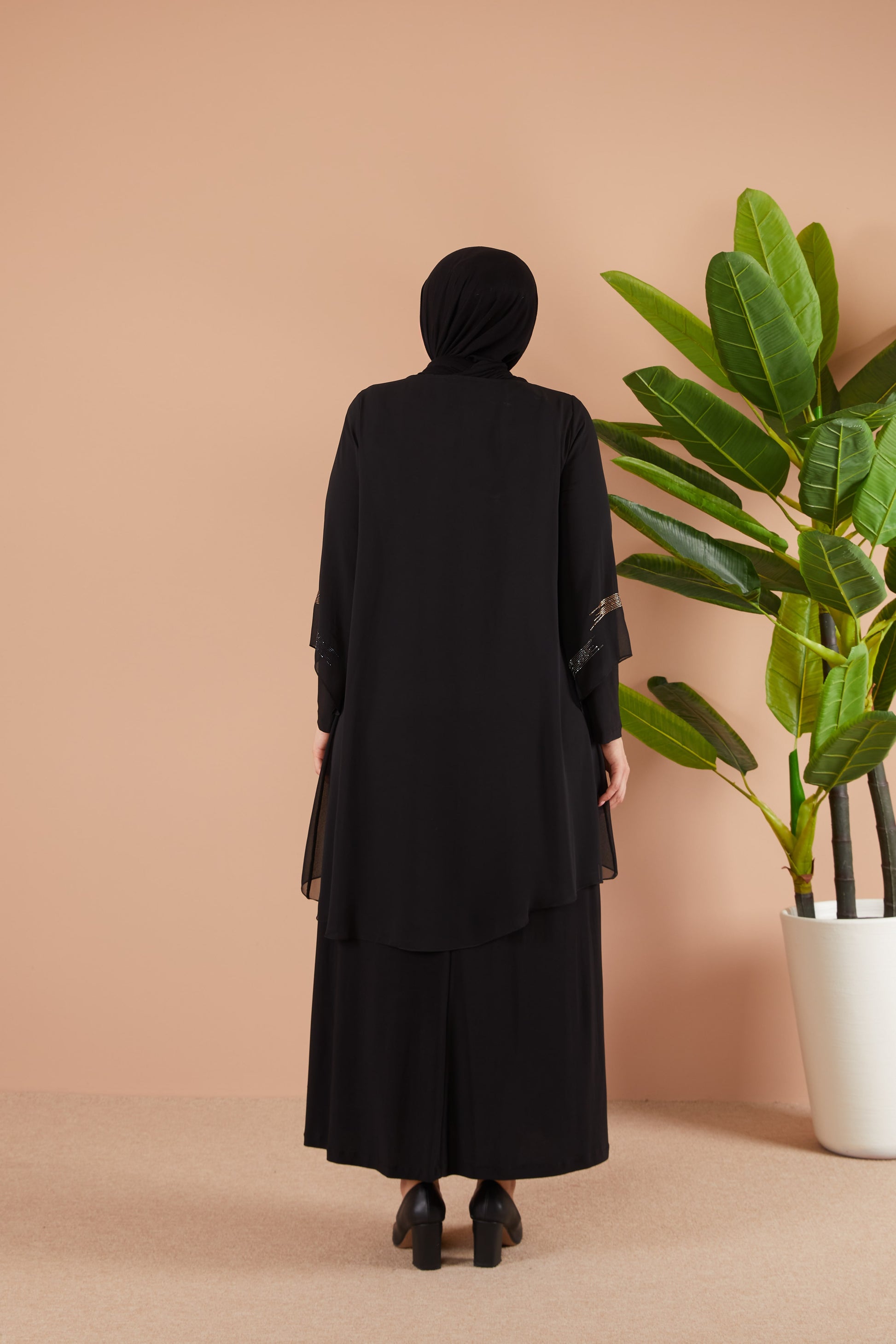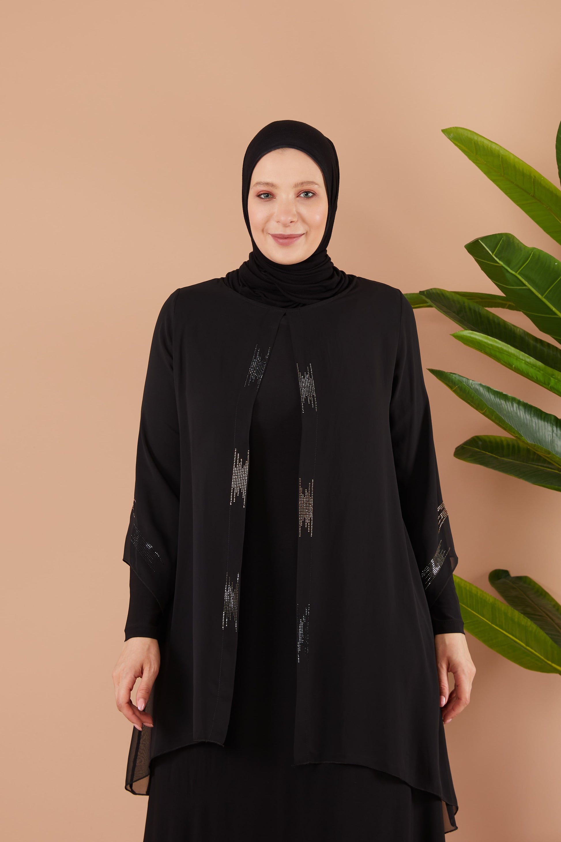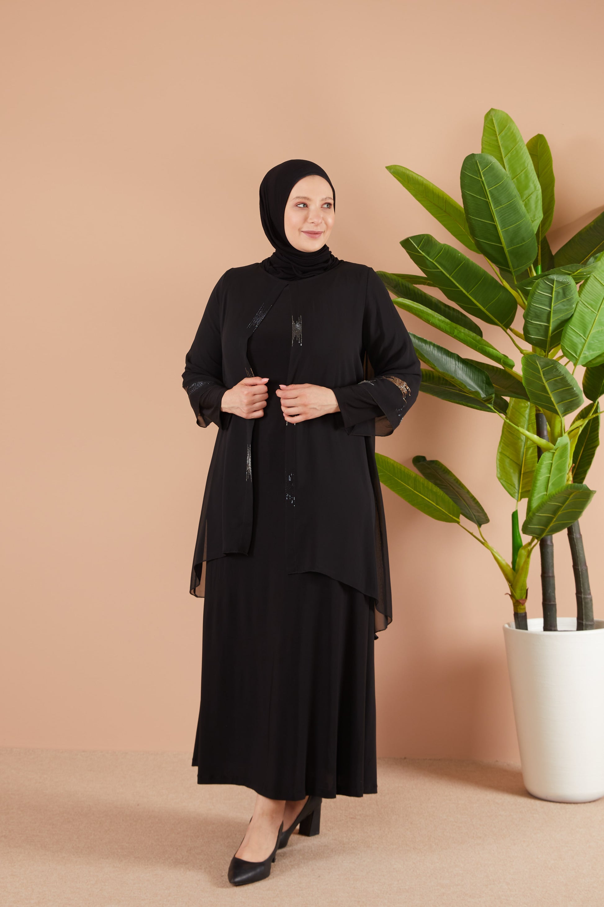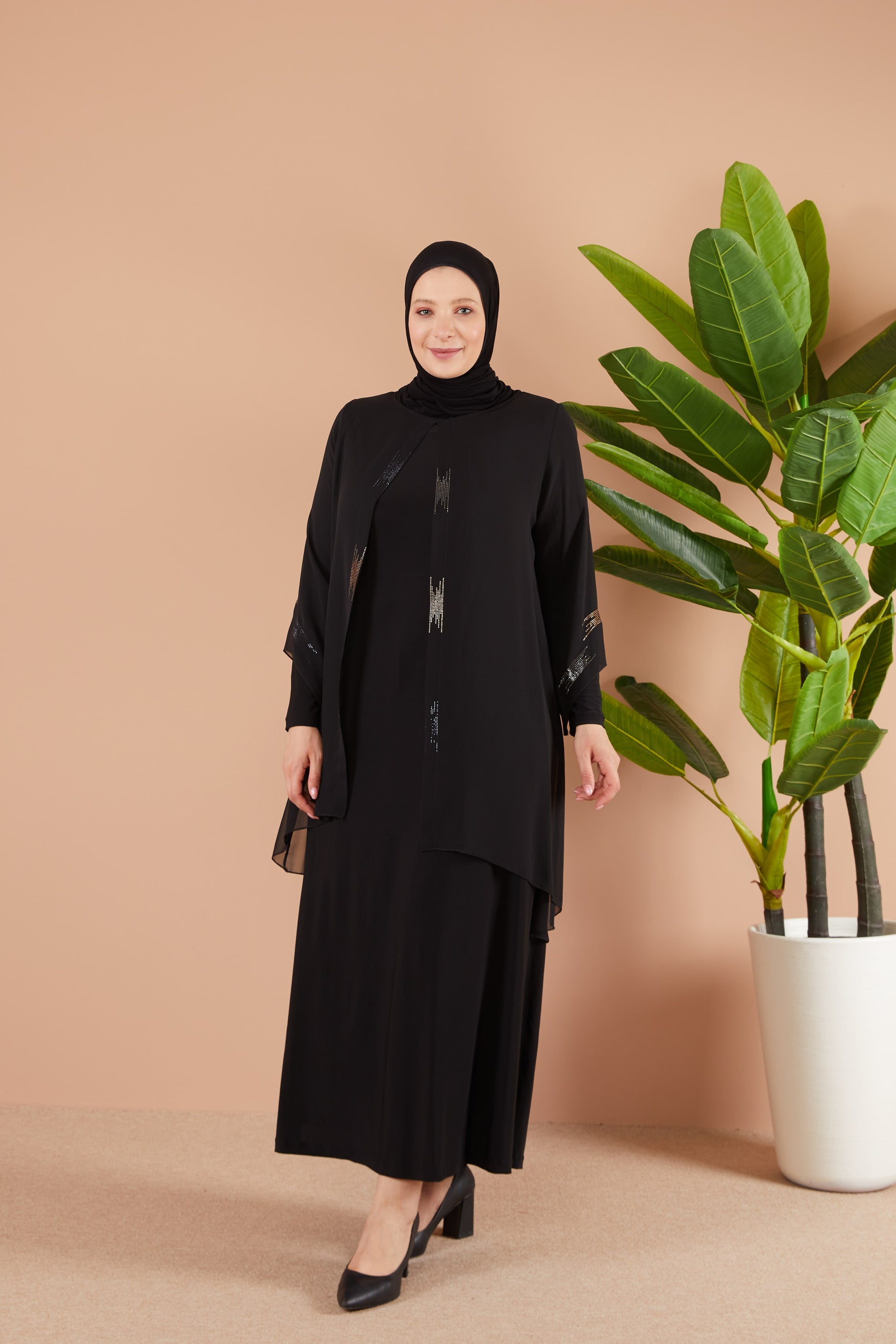 Önü ve Arkası Şifonlu Taş Detaylı Büyük Beden Sendi Elbise Siyah | 801311