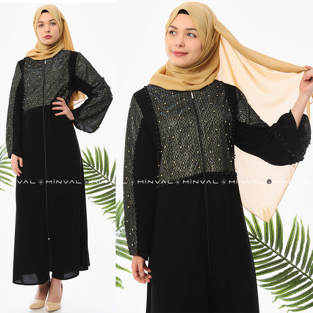 Önü ve Kolları Nakışlı ve Boncuklu Ferace Siyah | 20221
