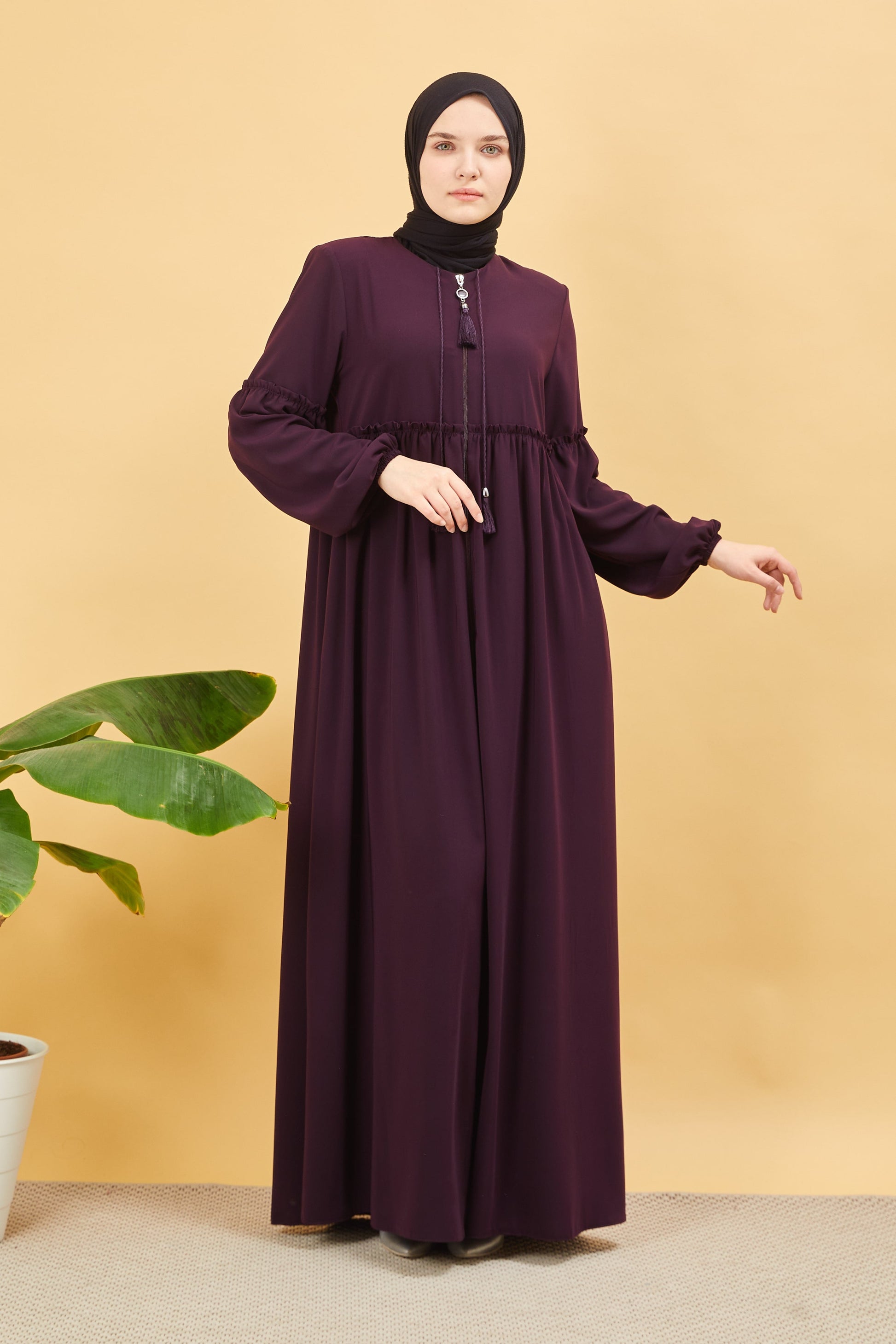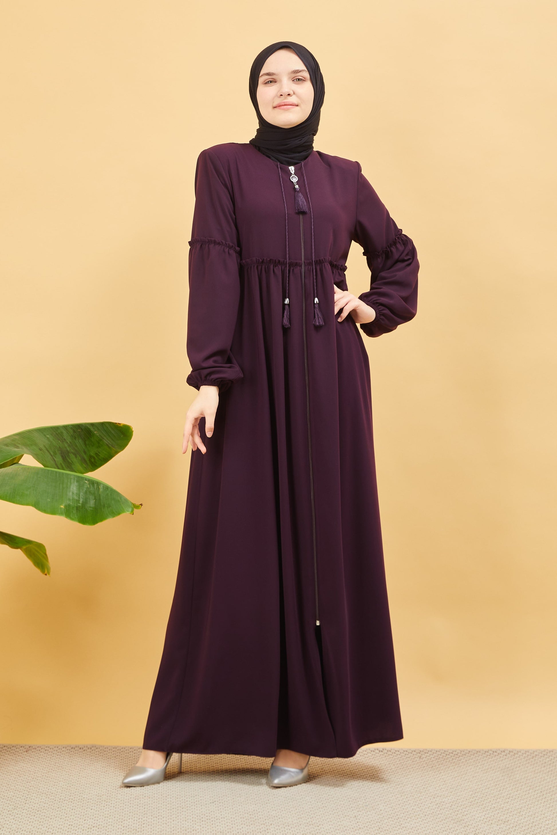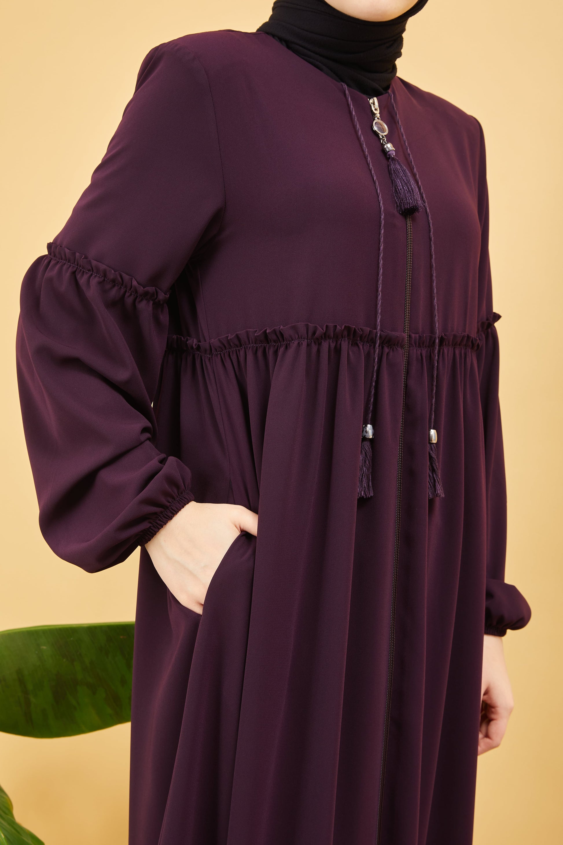 Önü ve Kolu Büzgülü Bileği Lastikli Geniş Kol Ferace Mürdüm | 20618