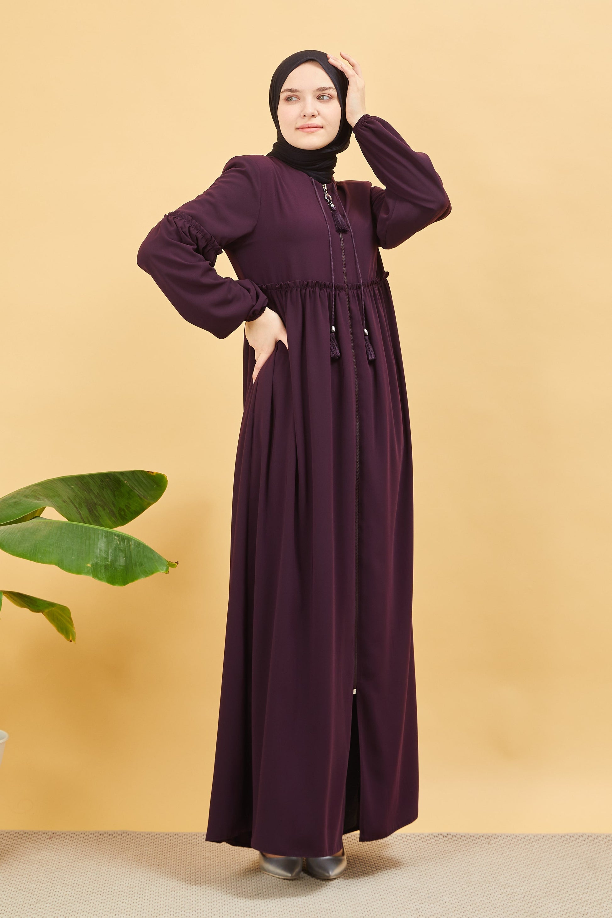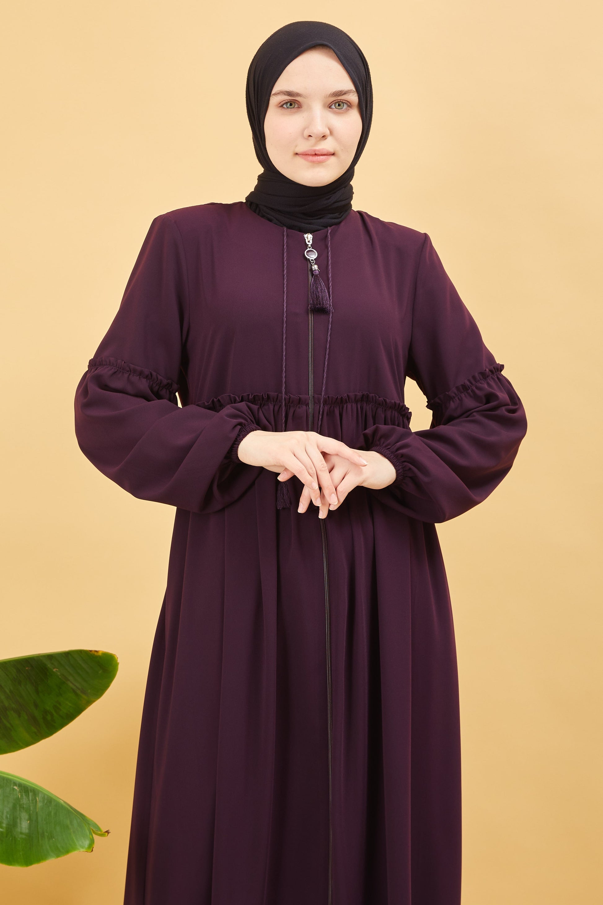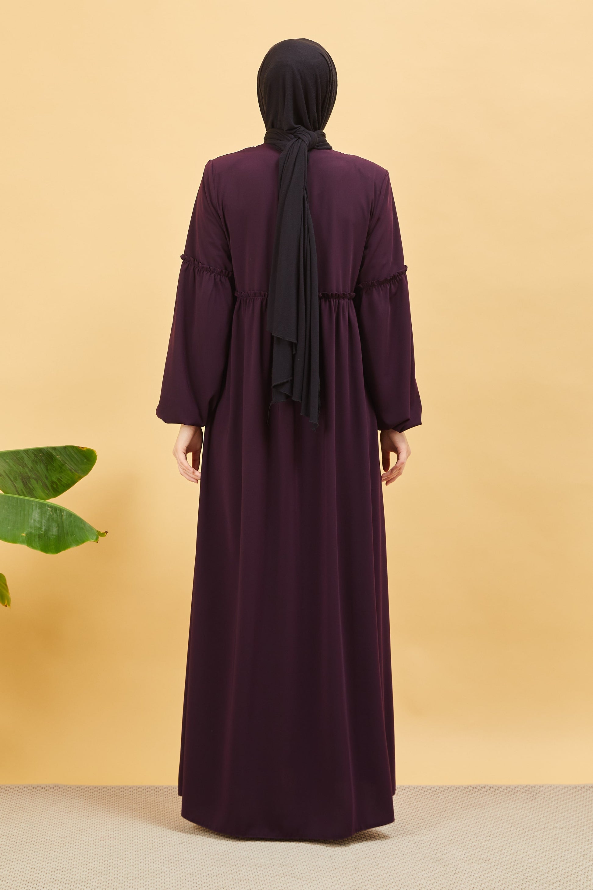 Önü ve Kolu Büzgülü Bileği Lastikli Geniş Kol Ferace Mürdüm | 20618