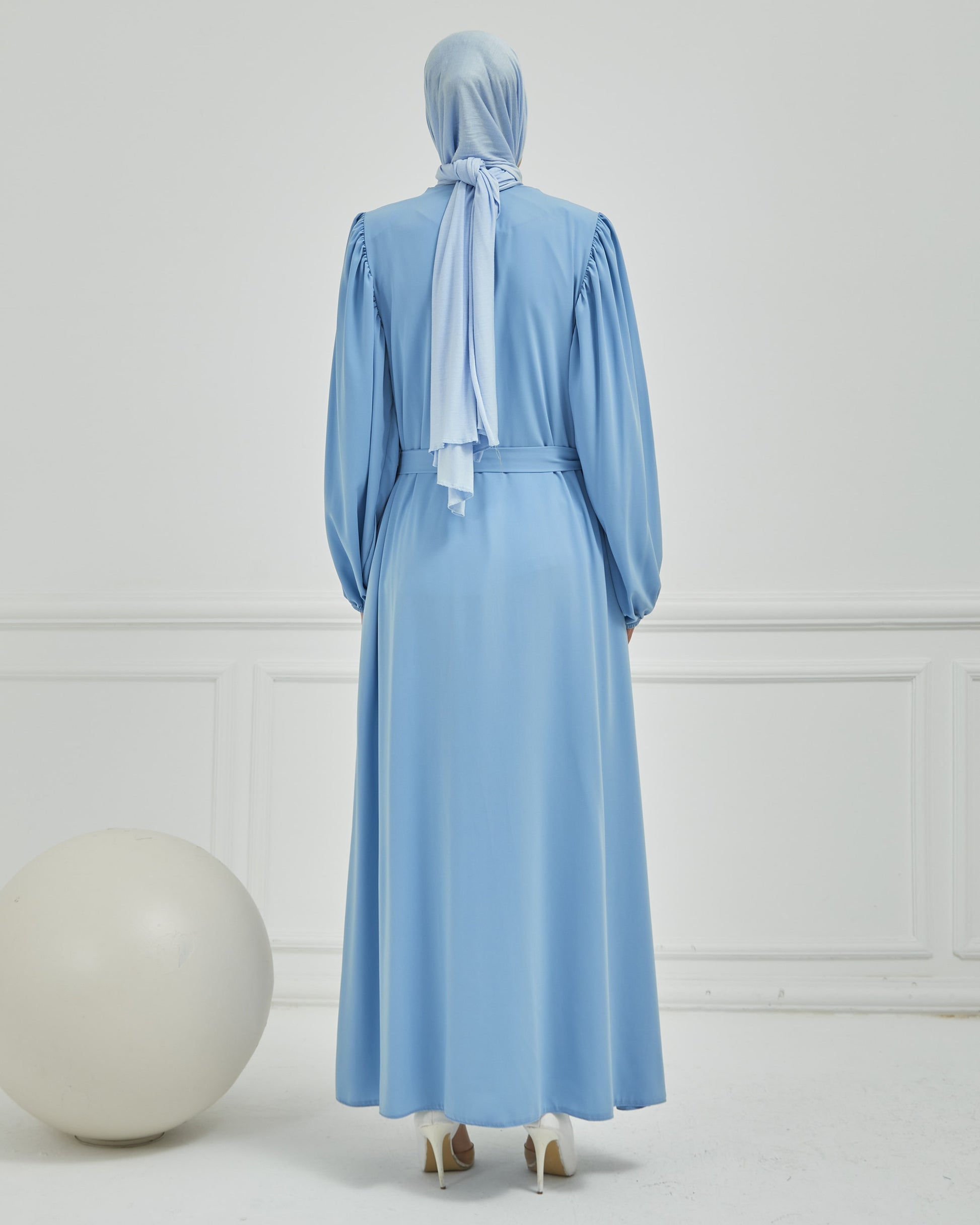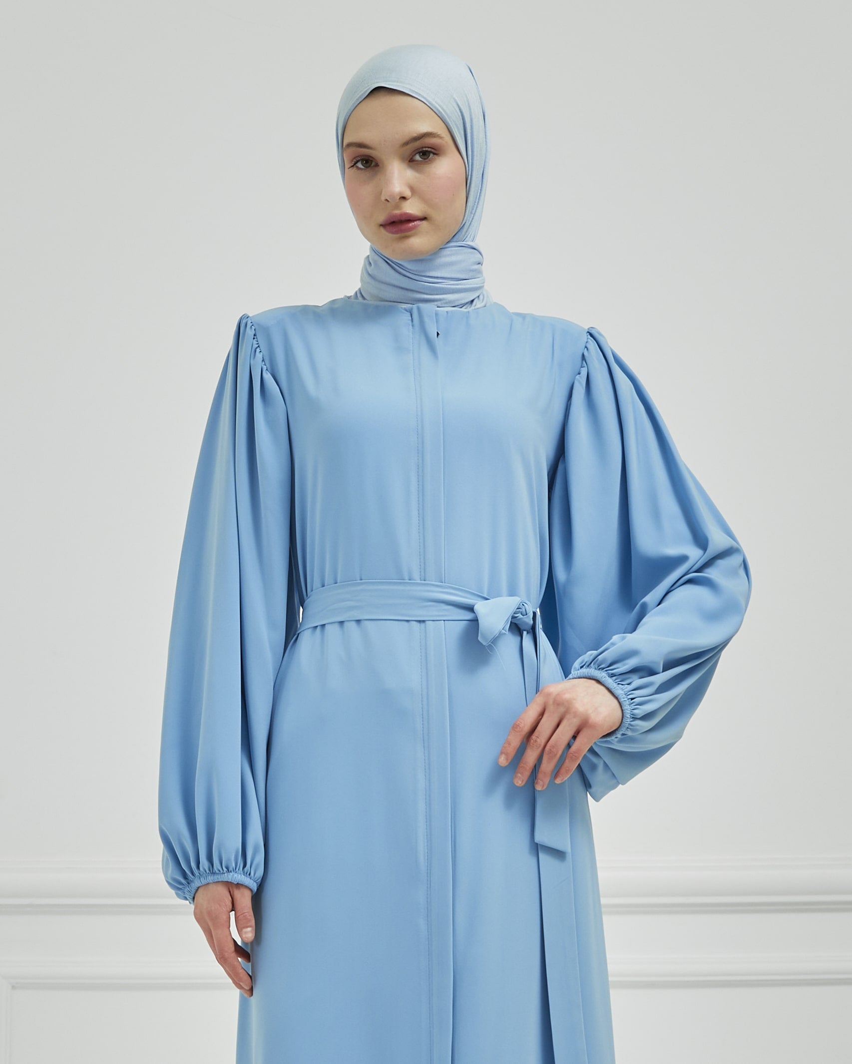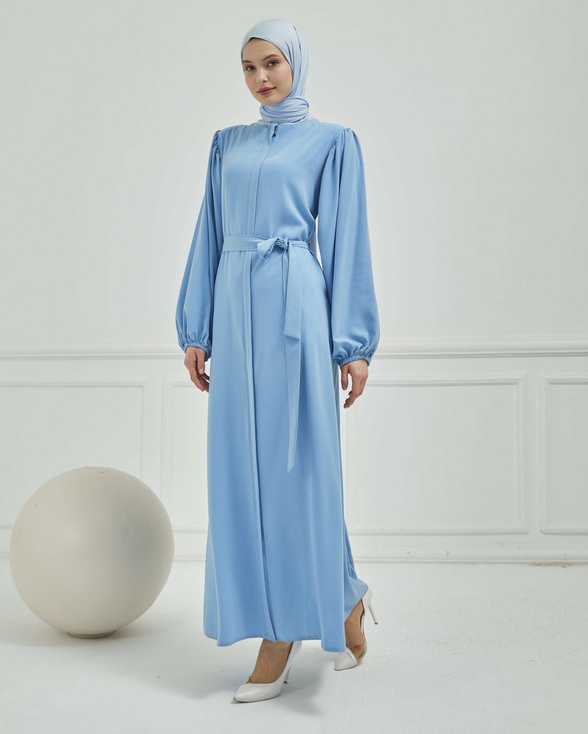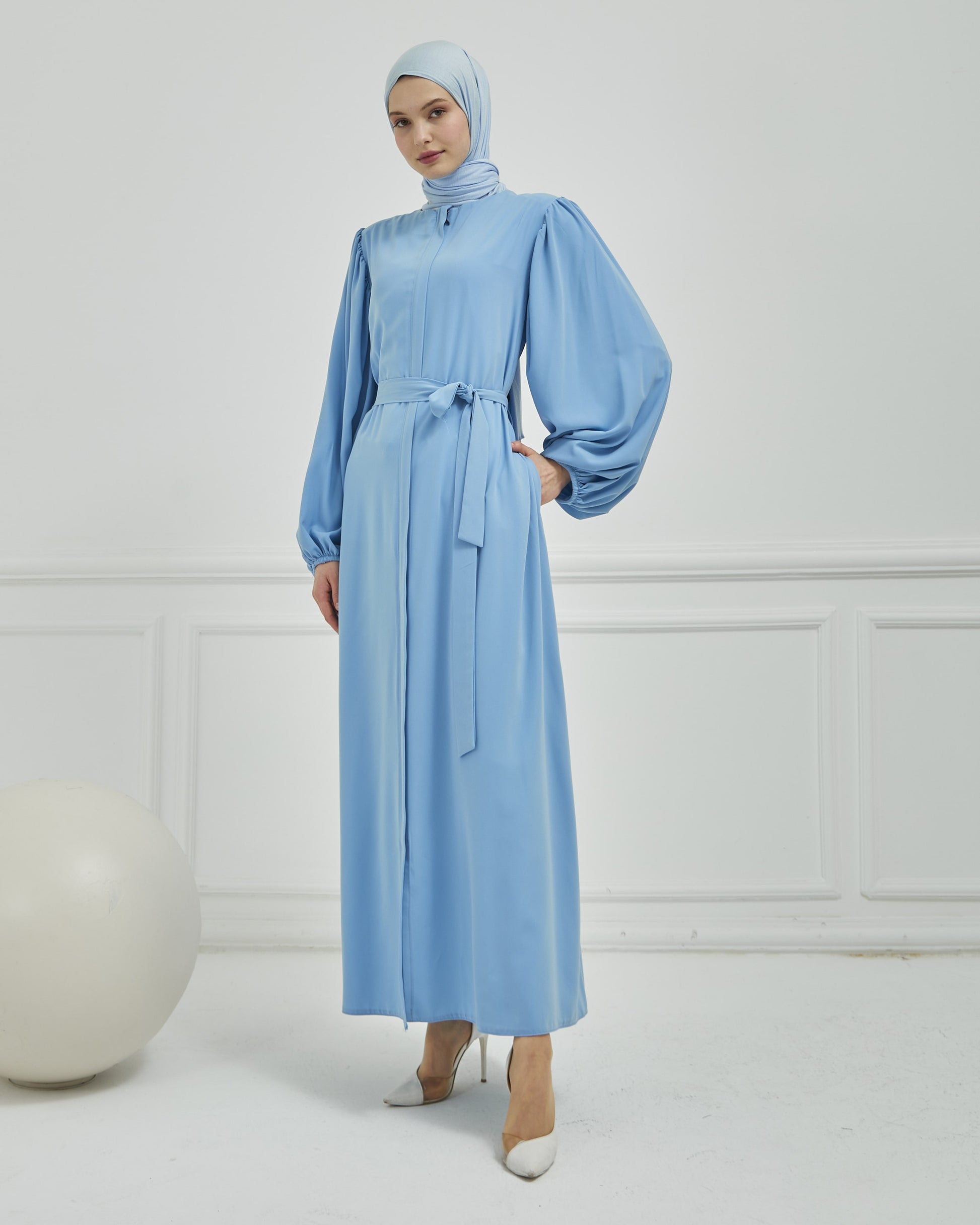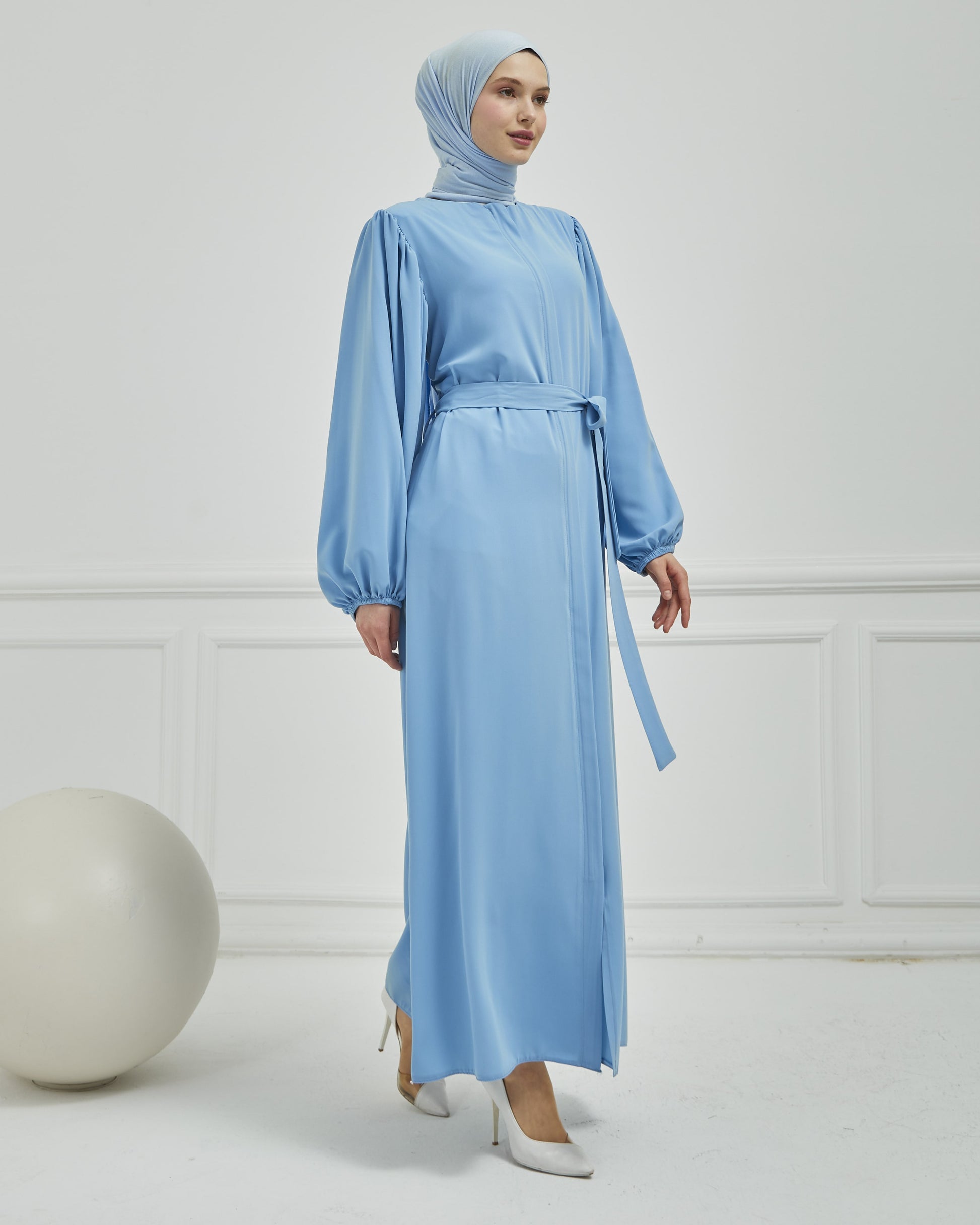 Abaya grise à manches ballon et ceinture à la taille | 2077-24