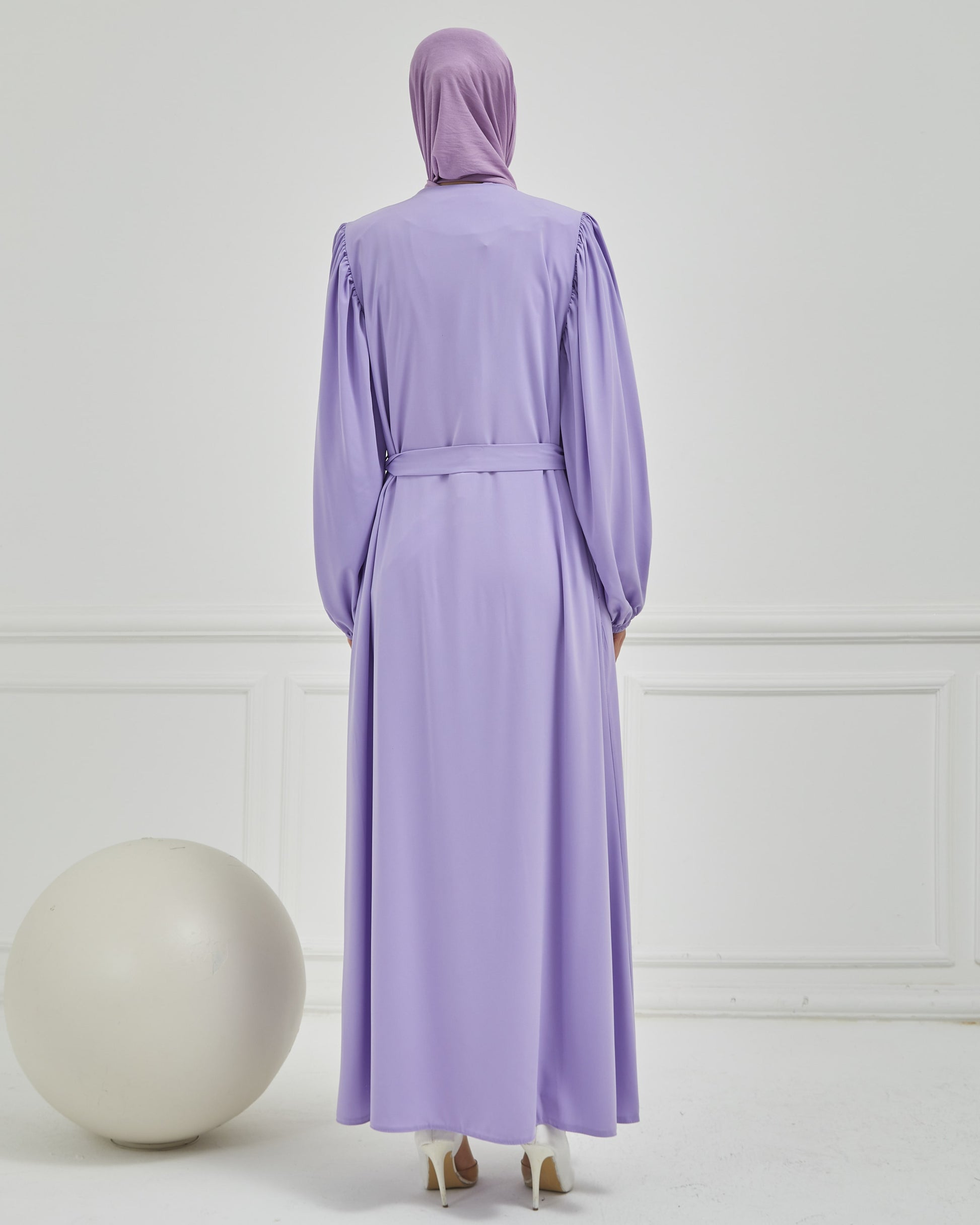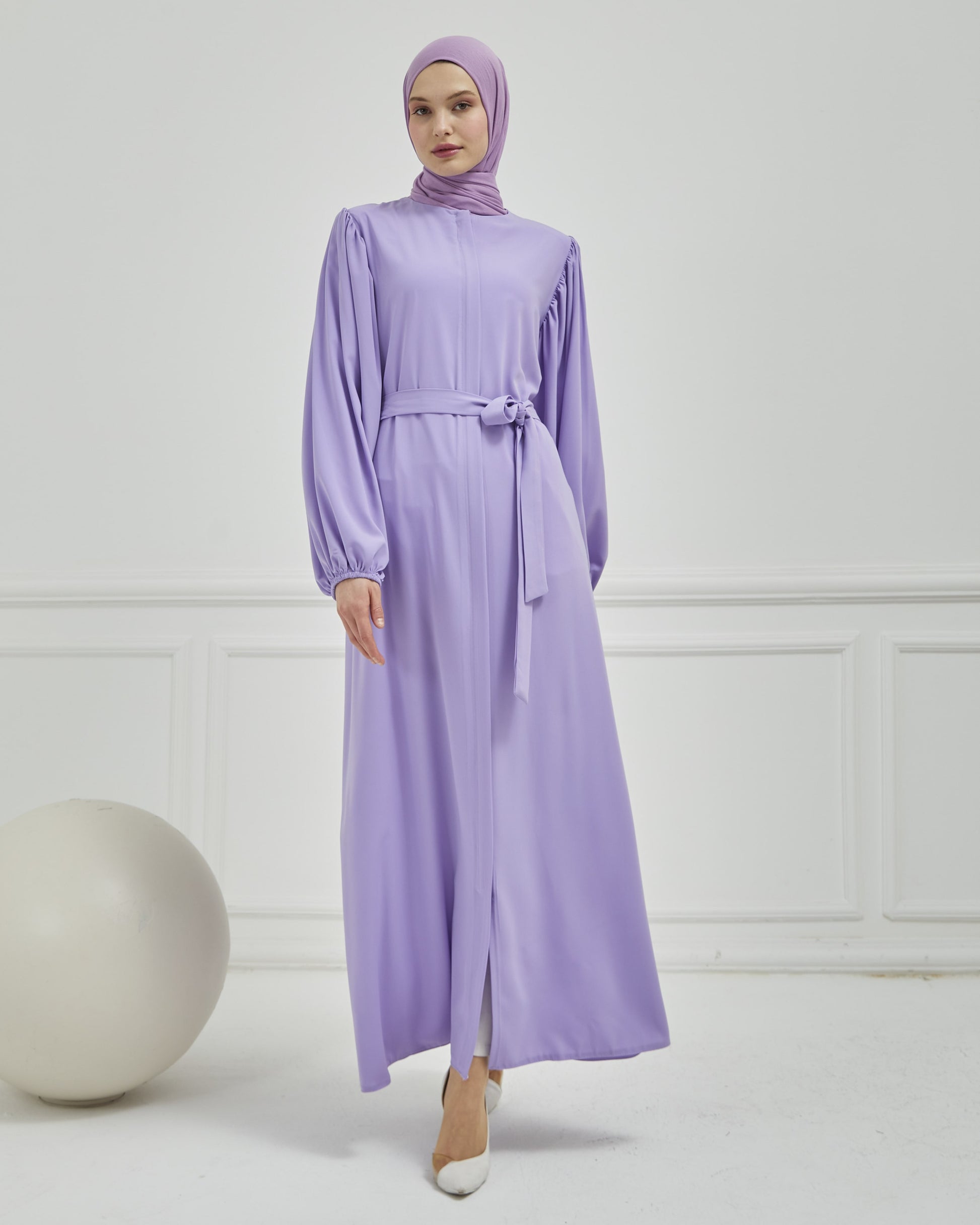 Abaya grise à manches ballon et ceinture à la taille | 2077-24