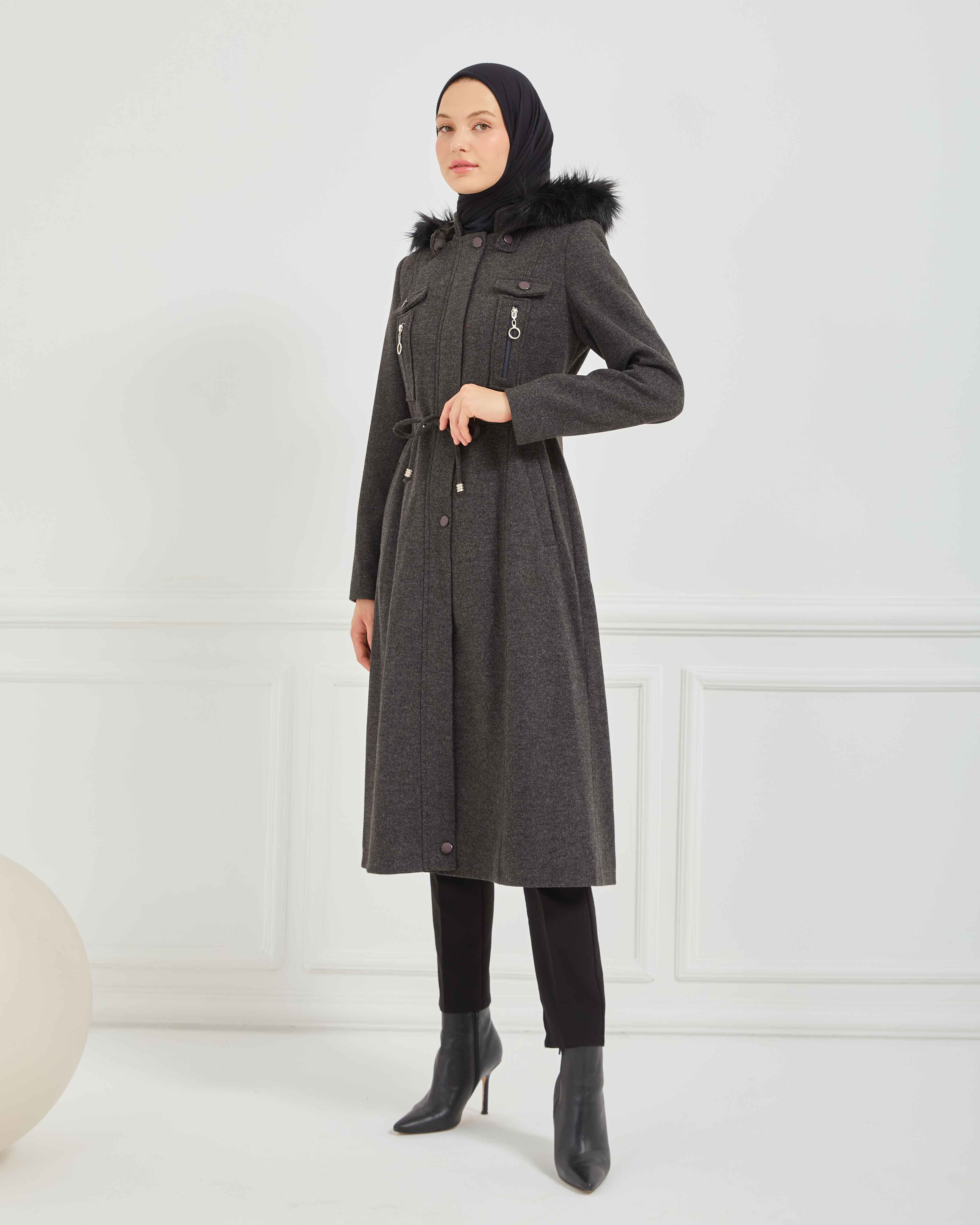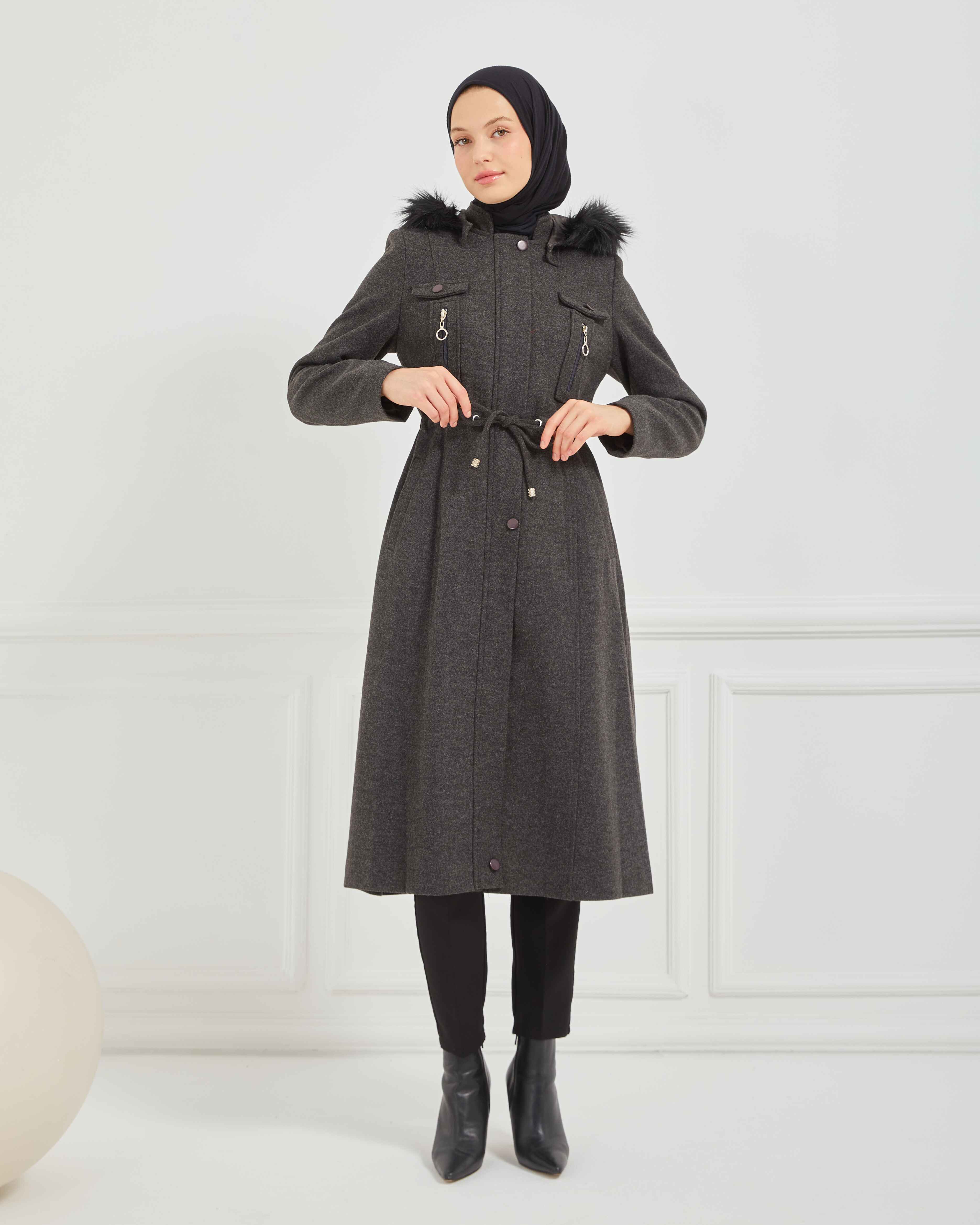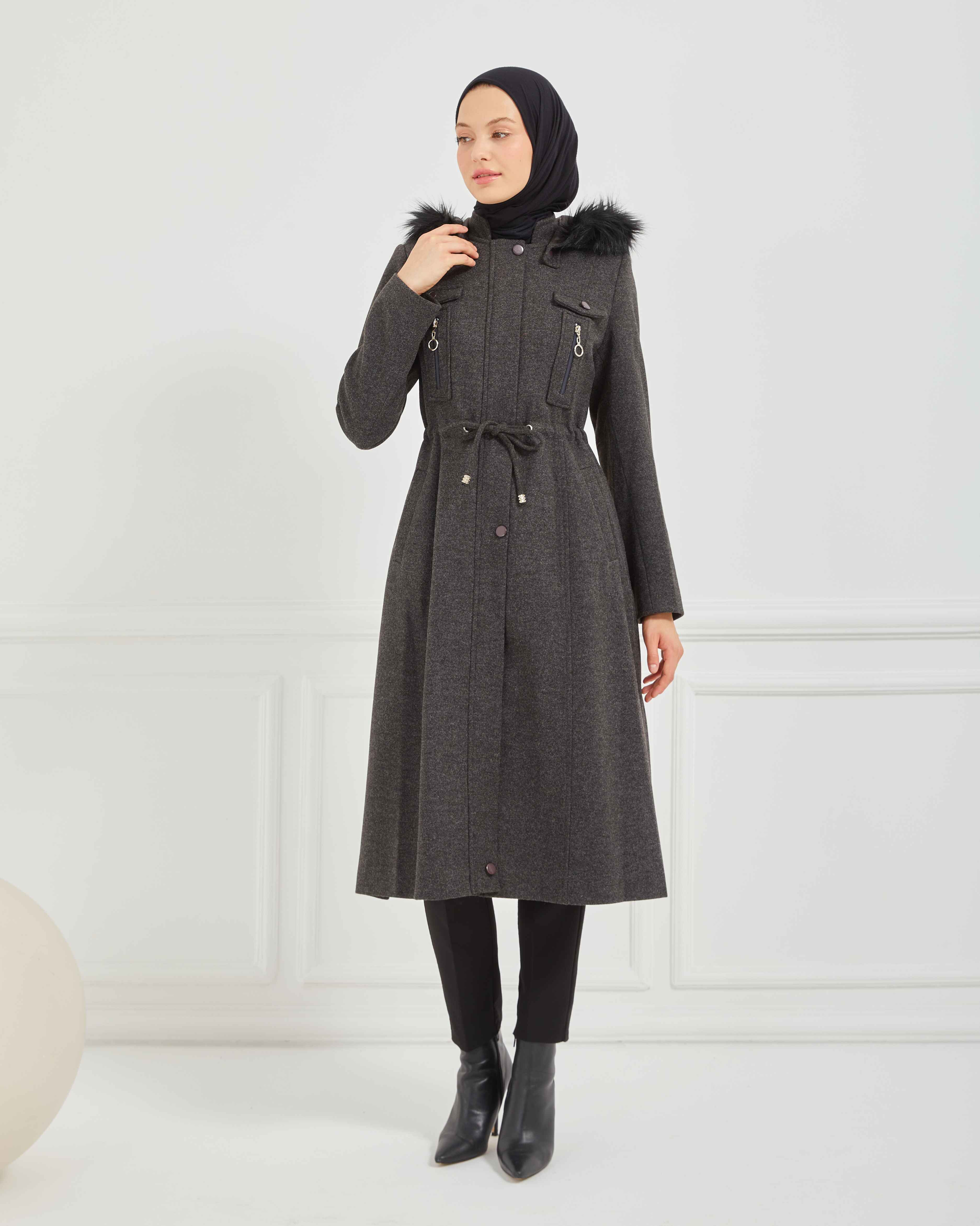 Dizaltı Kapşonlu Kaşe Mont Füme | 17001K41