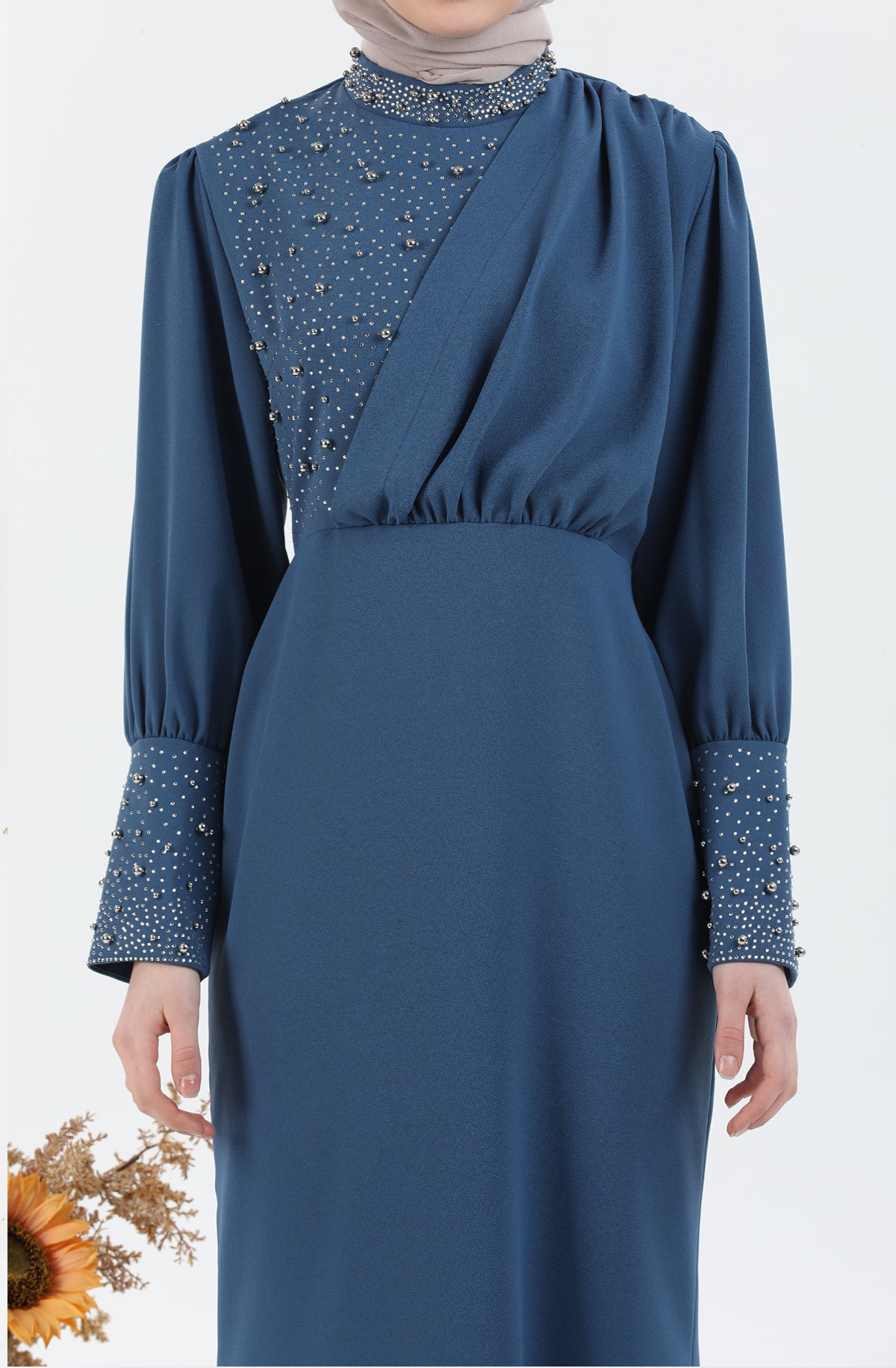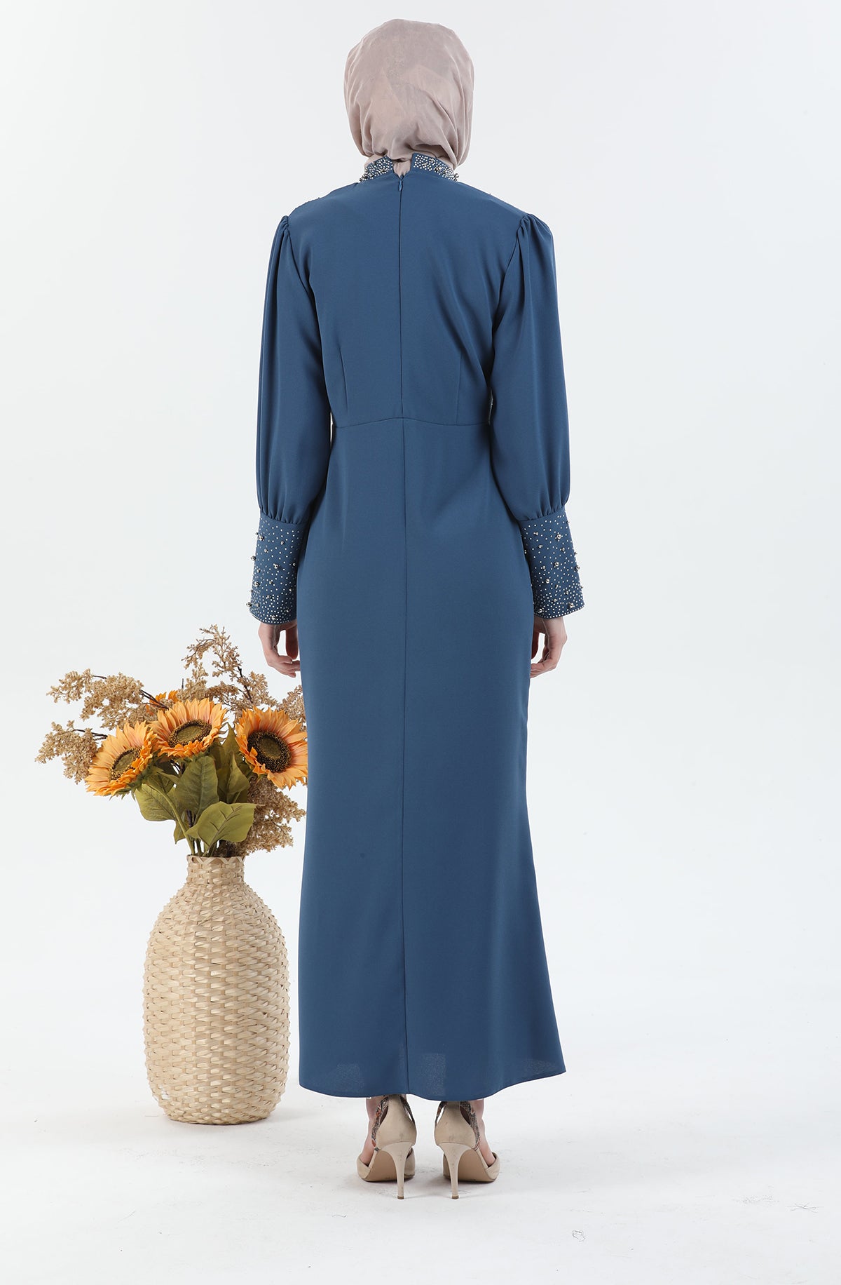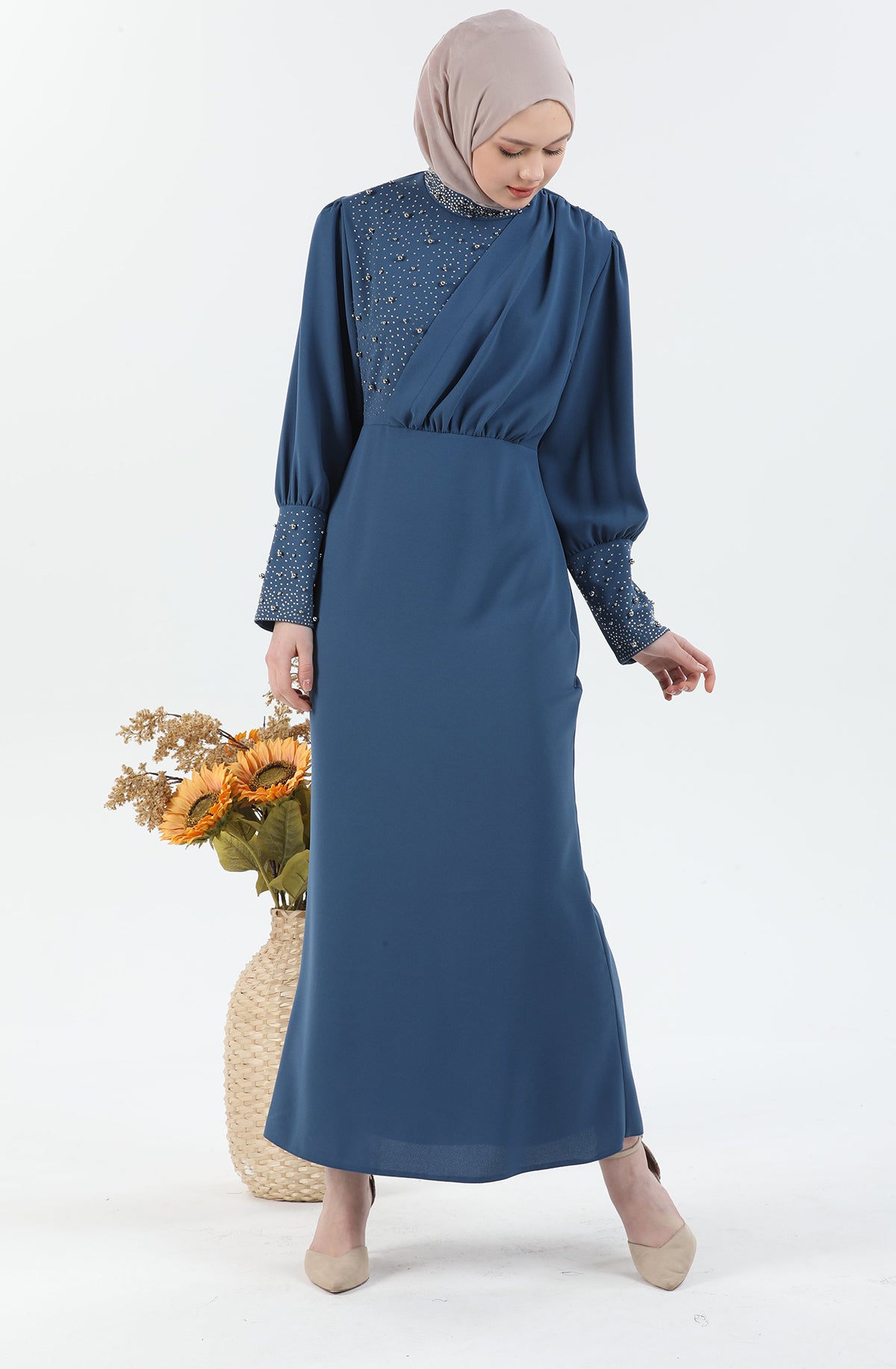 İnci Detaylı Tesettür Elbise İndigo | 30246
