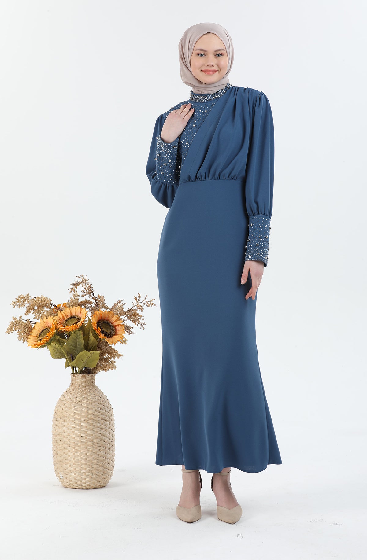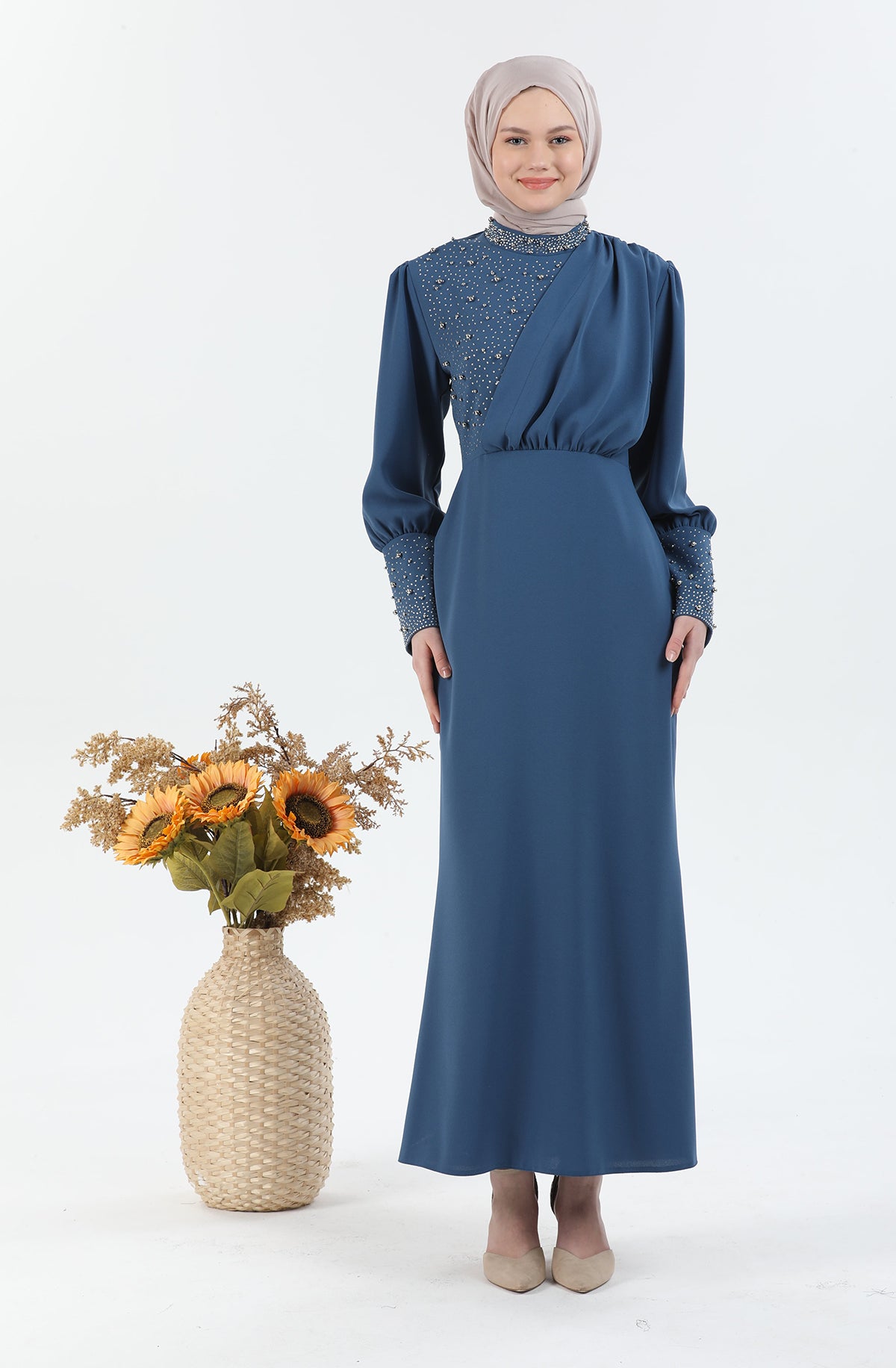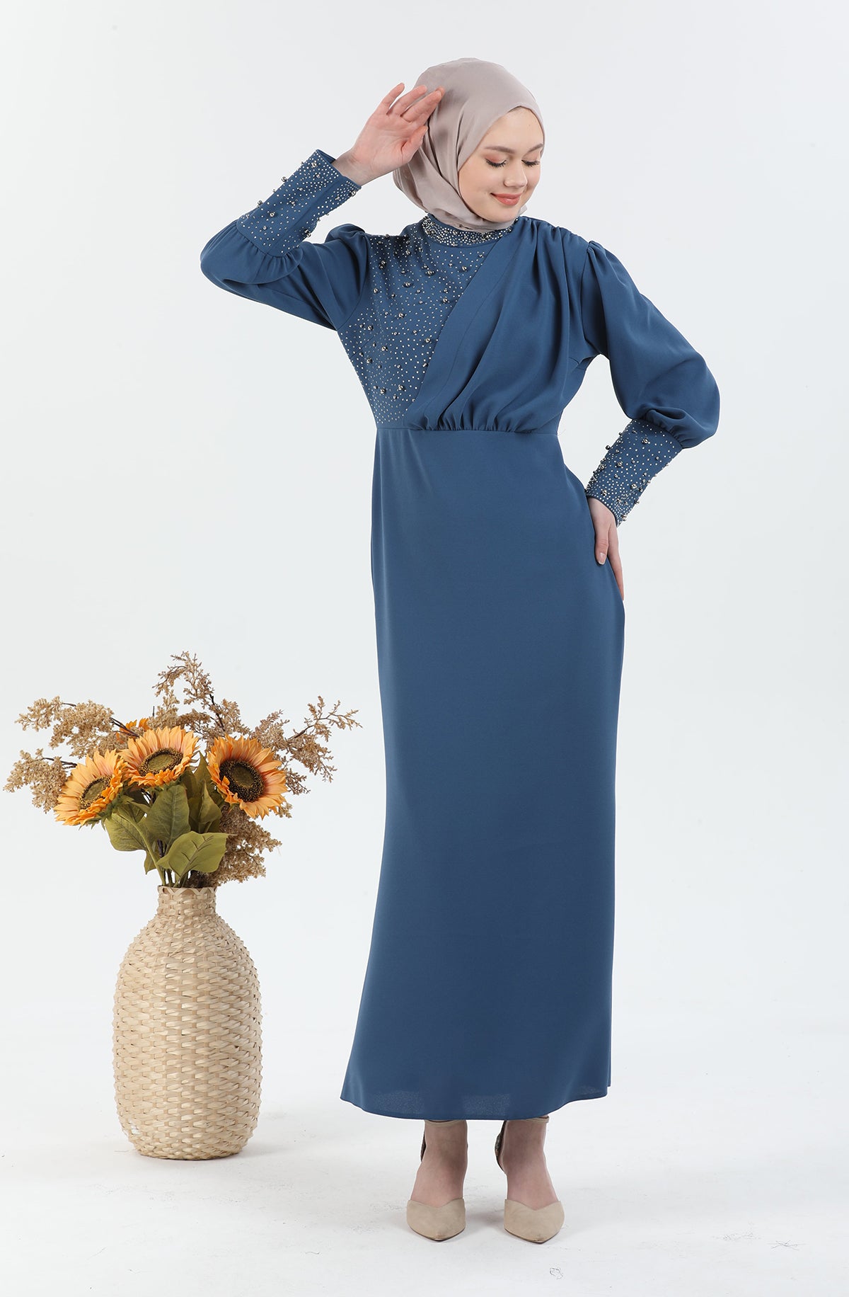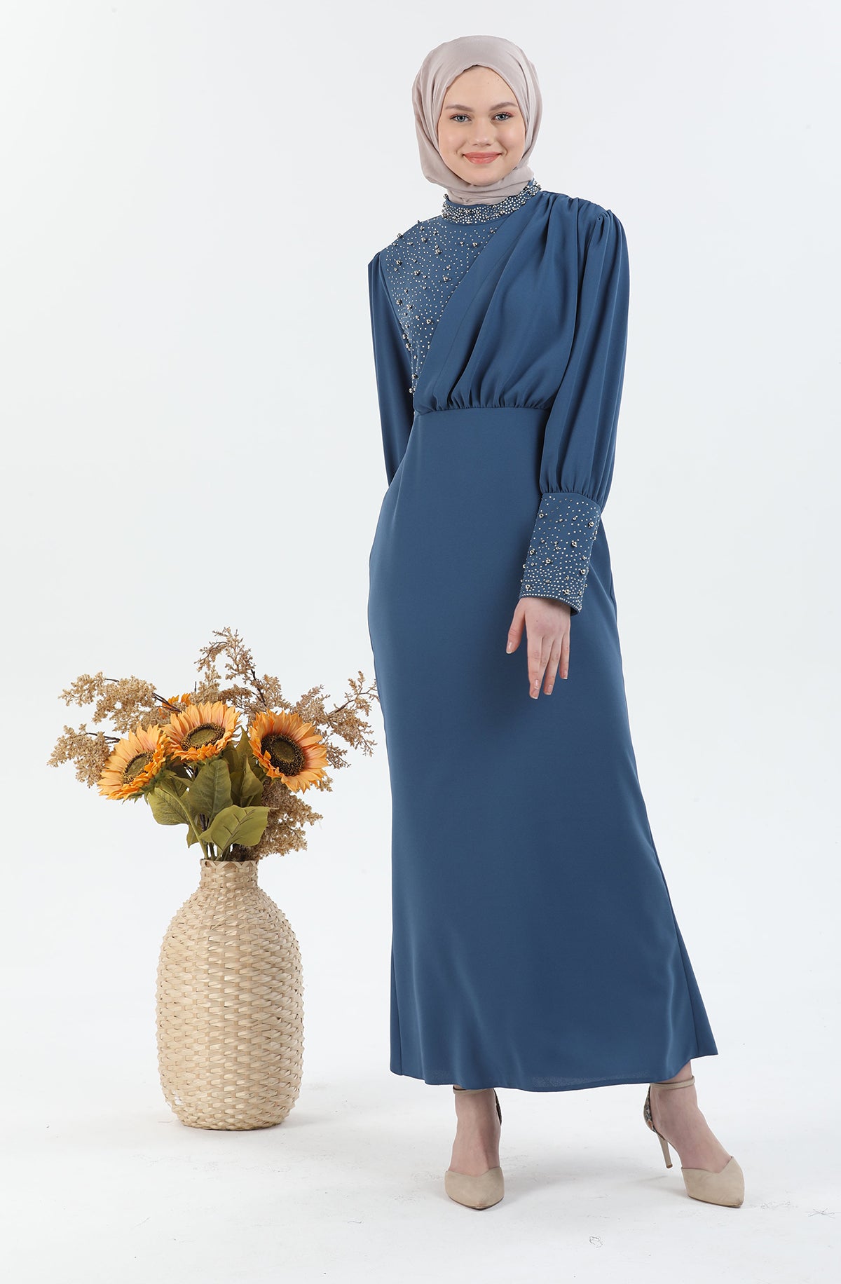 İnci Detaylı Tesettür Elbise İndigo | 30246