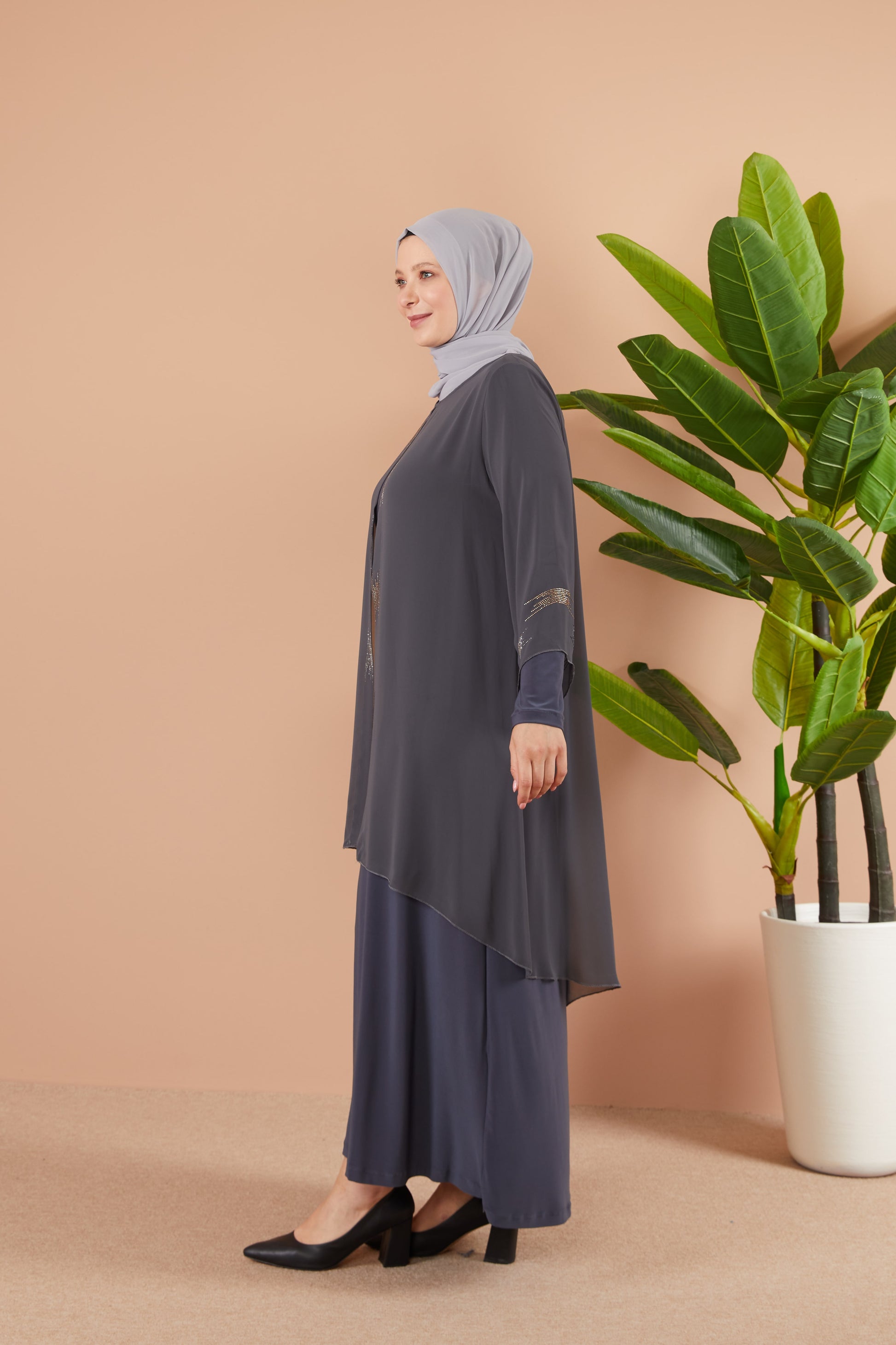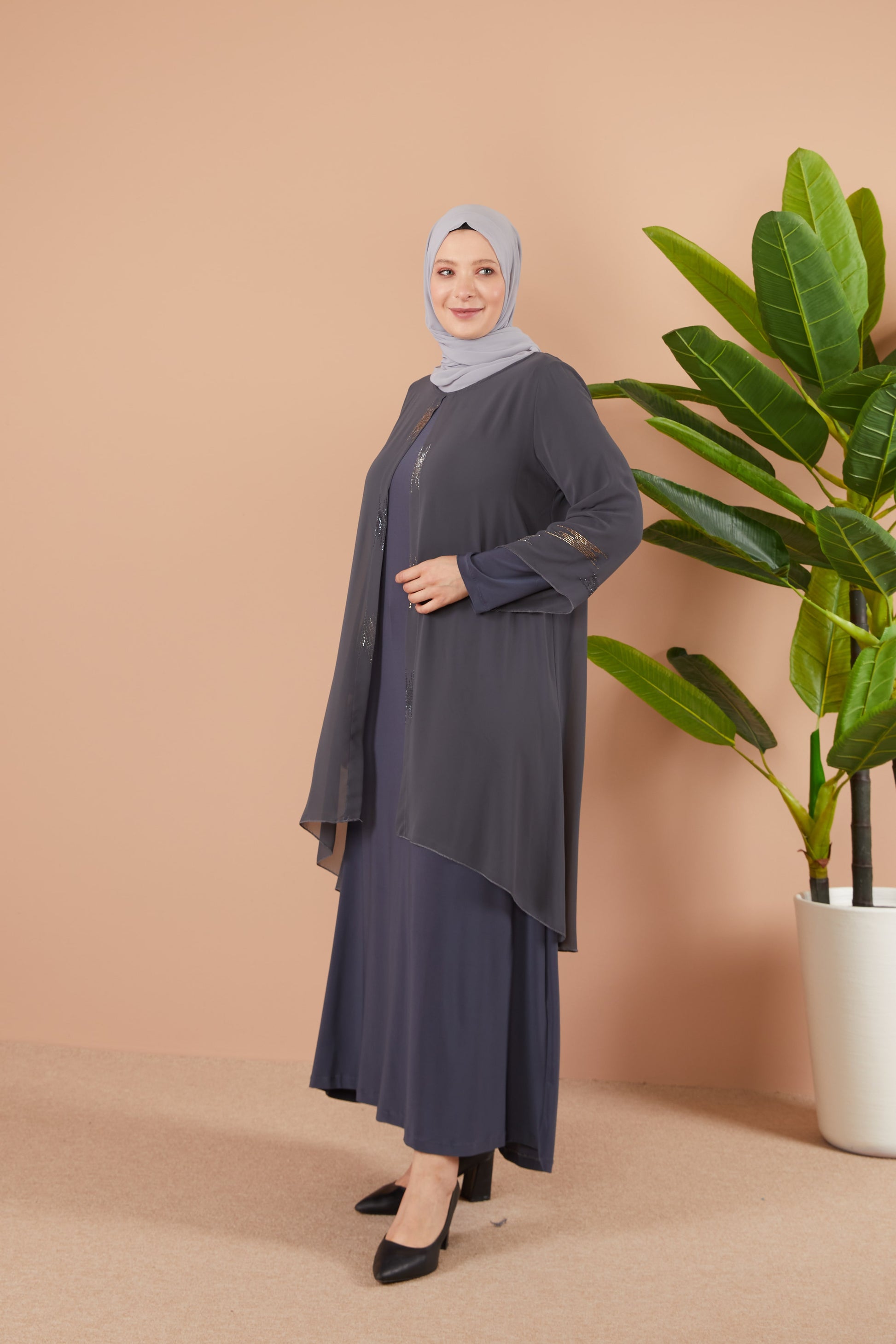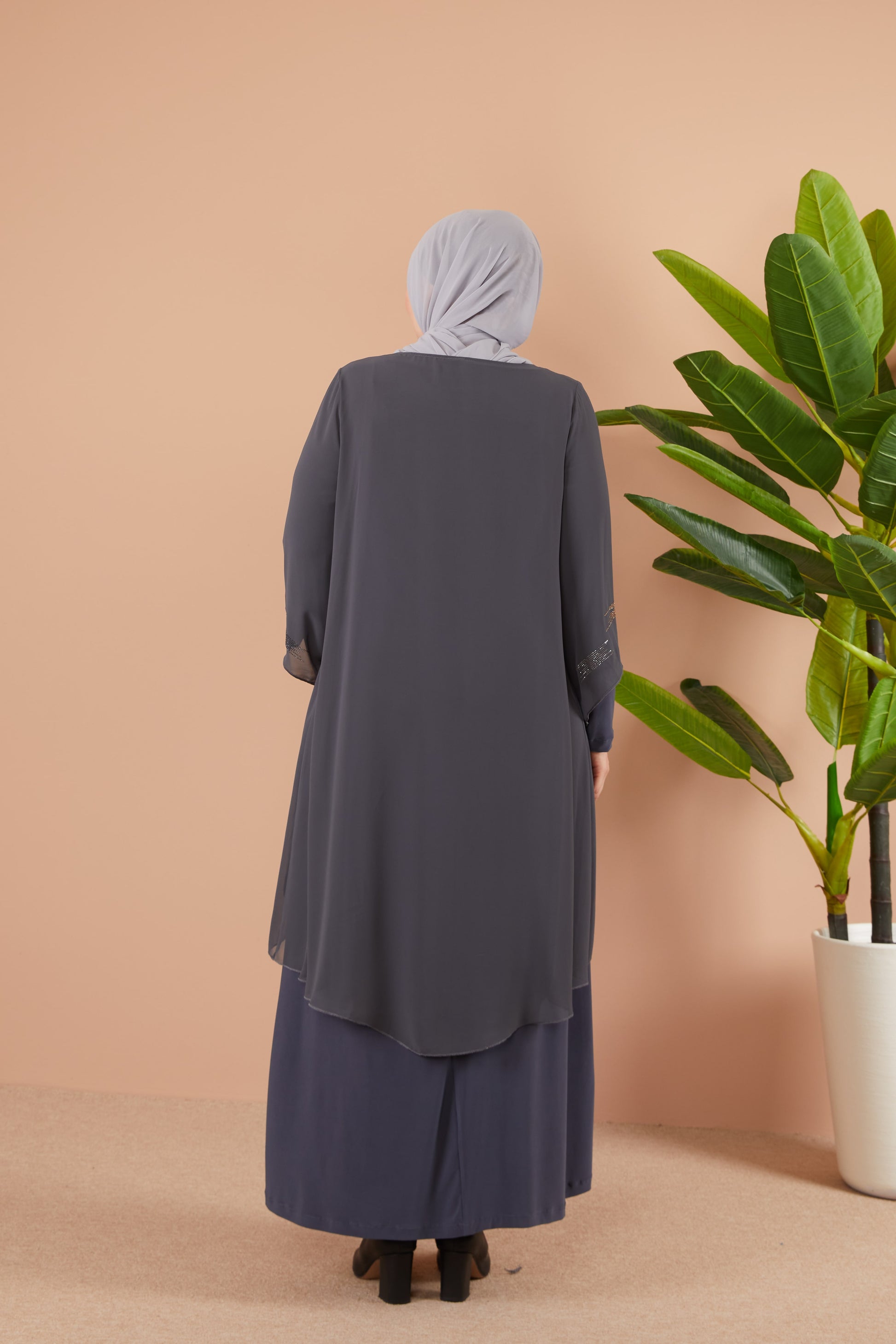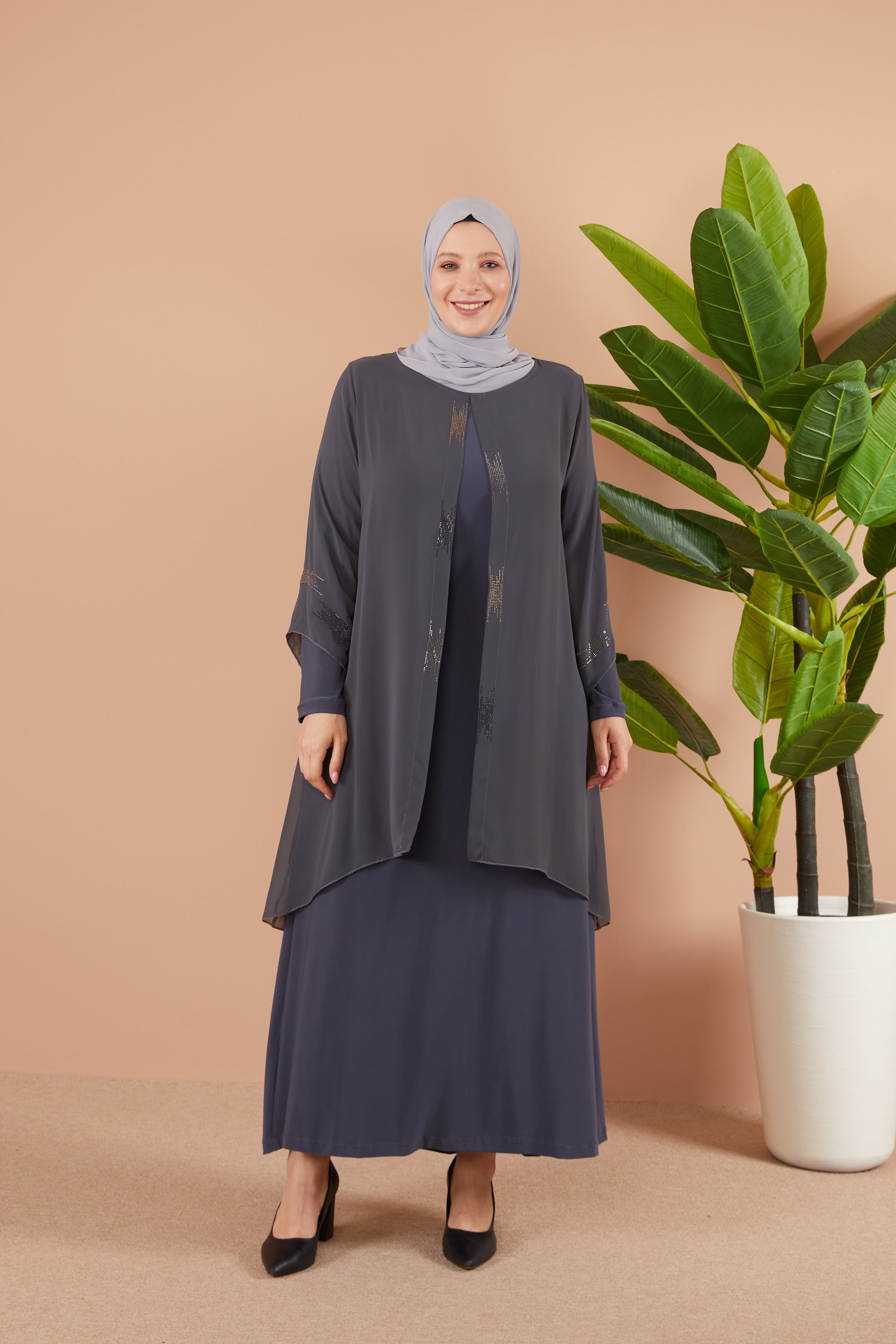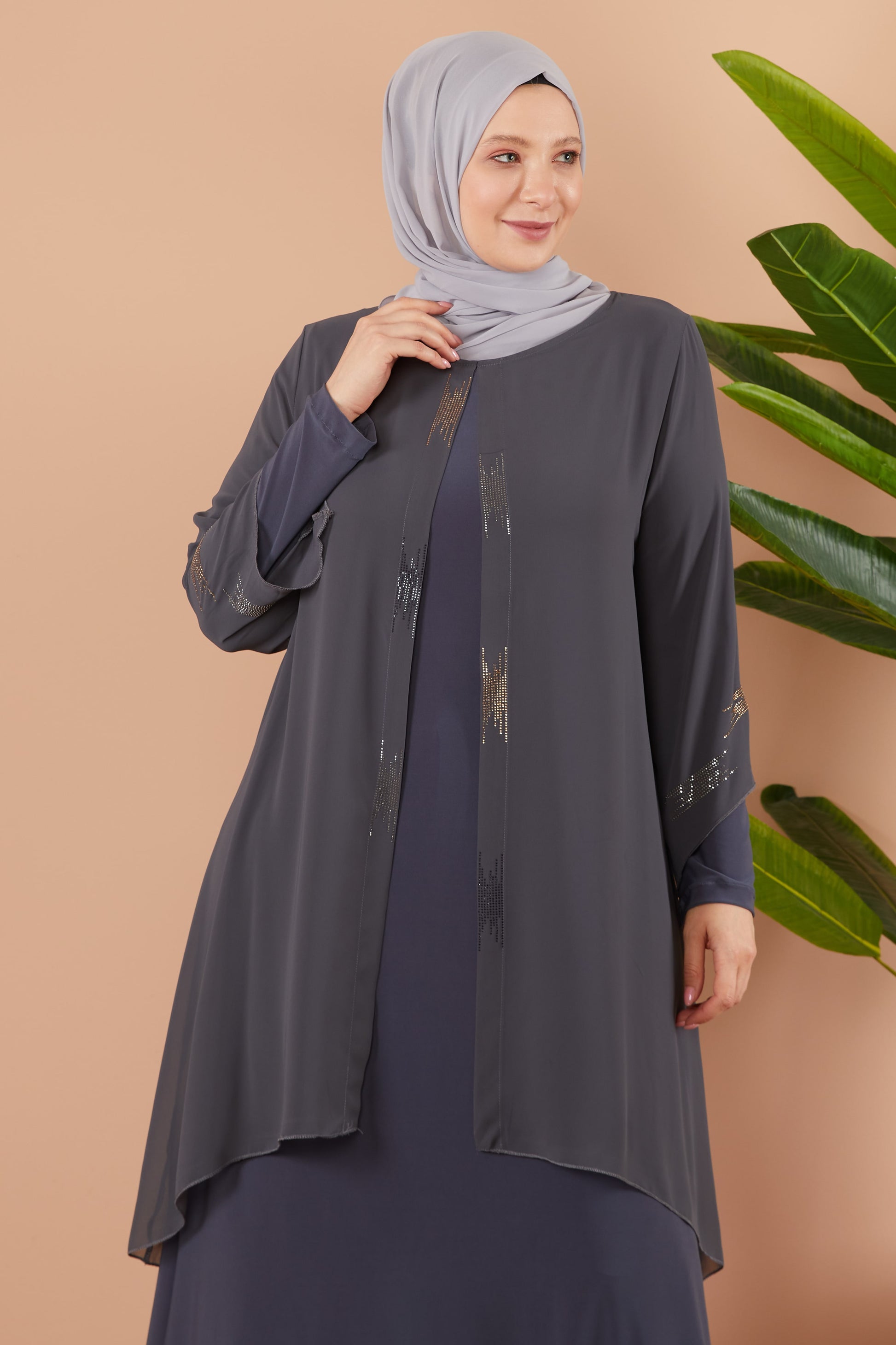 Önü ve Arkası Şifonlu Taş Detaylı Büyük Beden Sendi Elbise Gri | 8013124