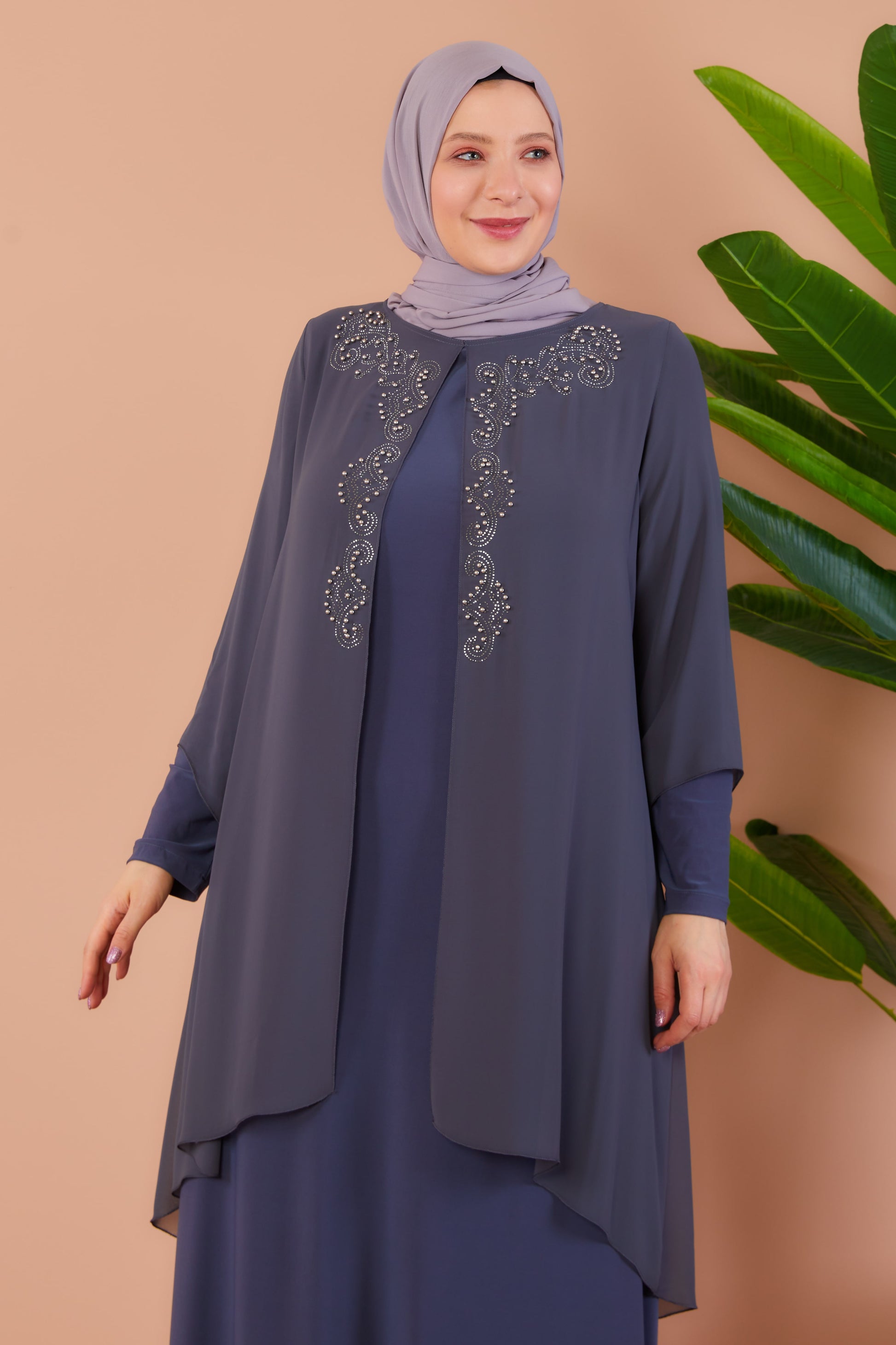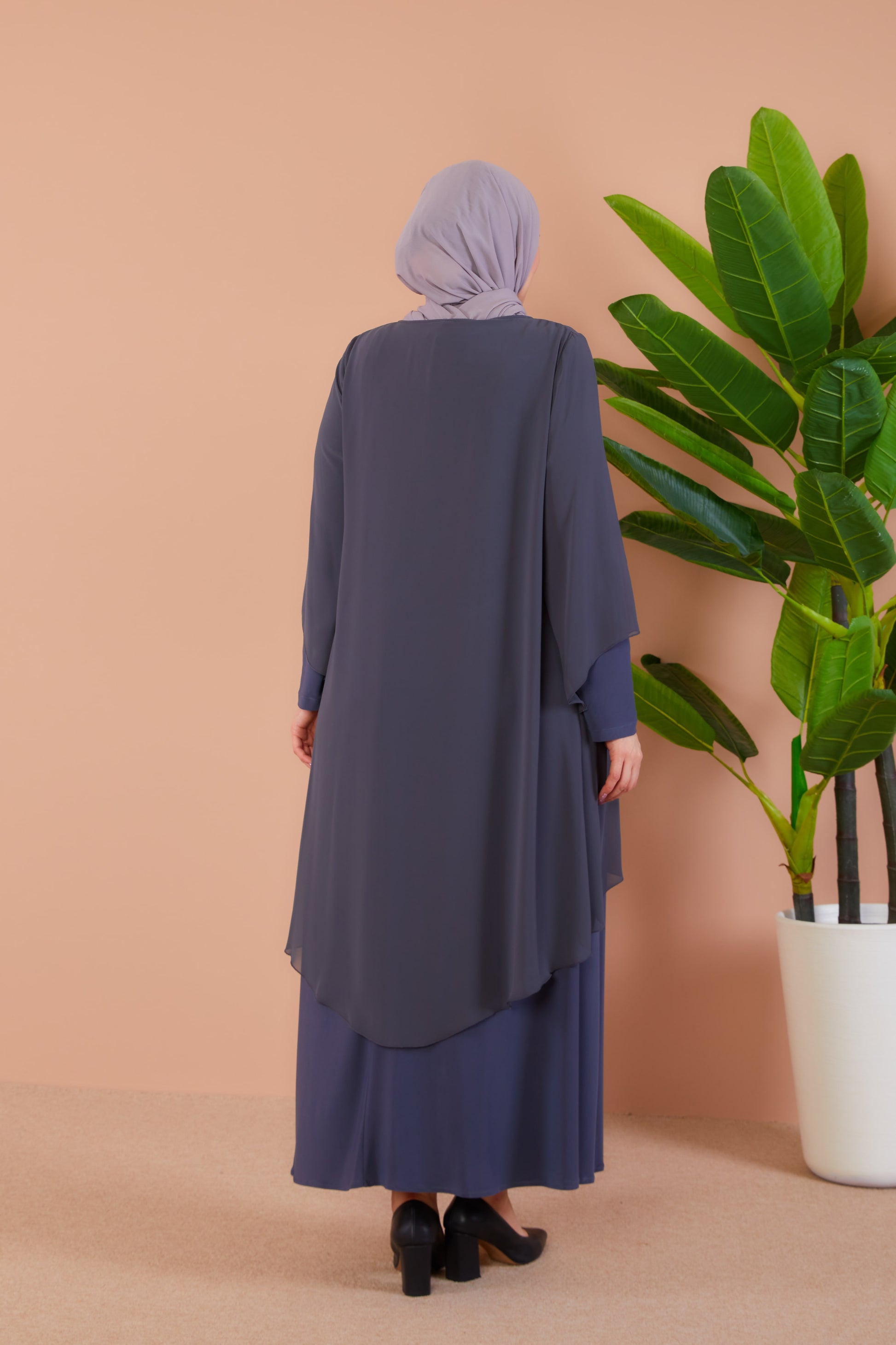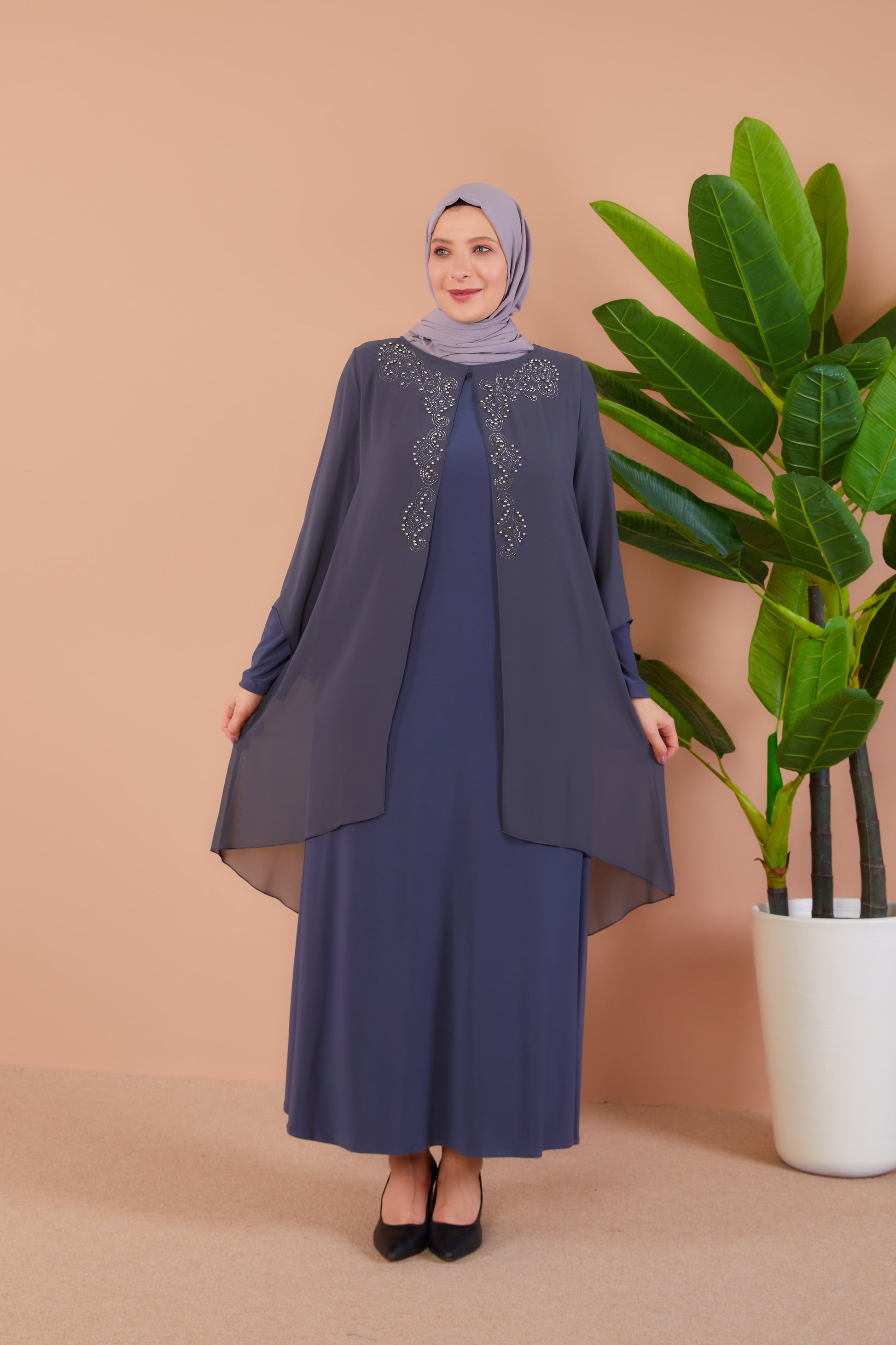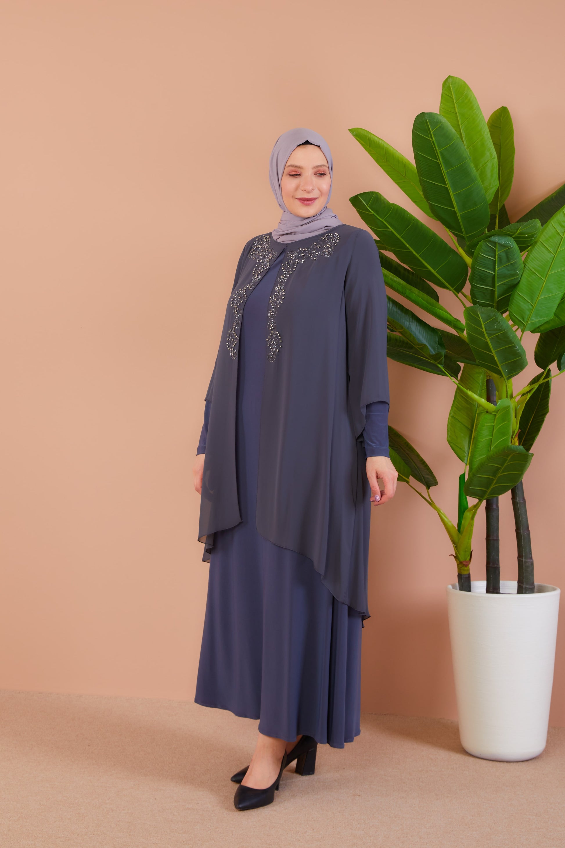 Önü ve Arkası Şifonlu Taş Detaylı Büyük Beden Sendi Elbise Gri | 8013224