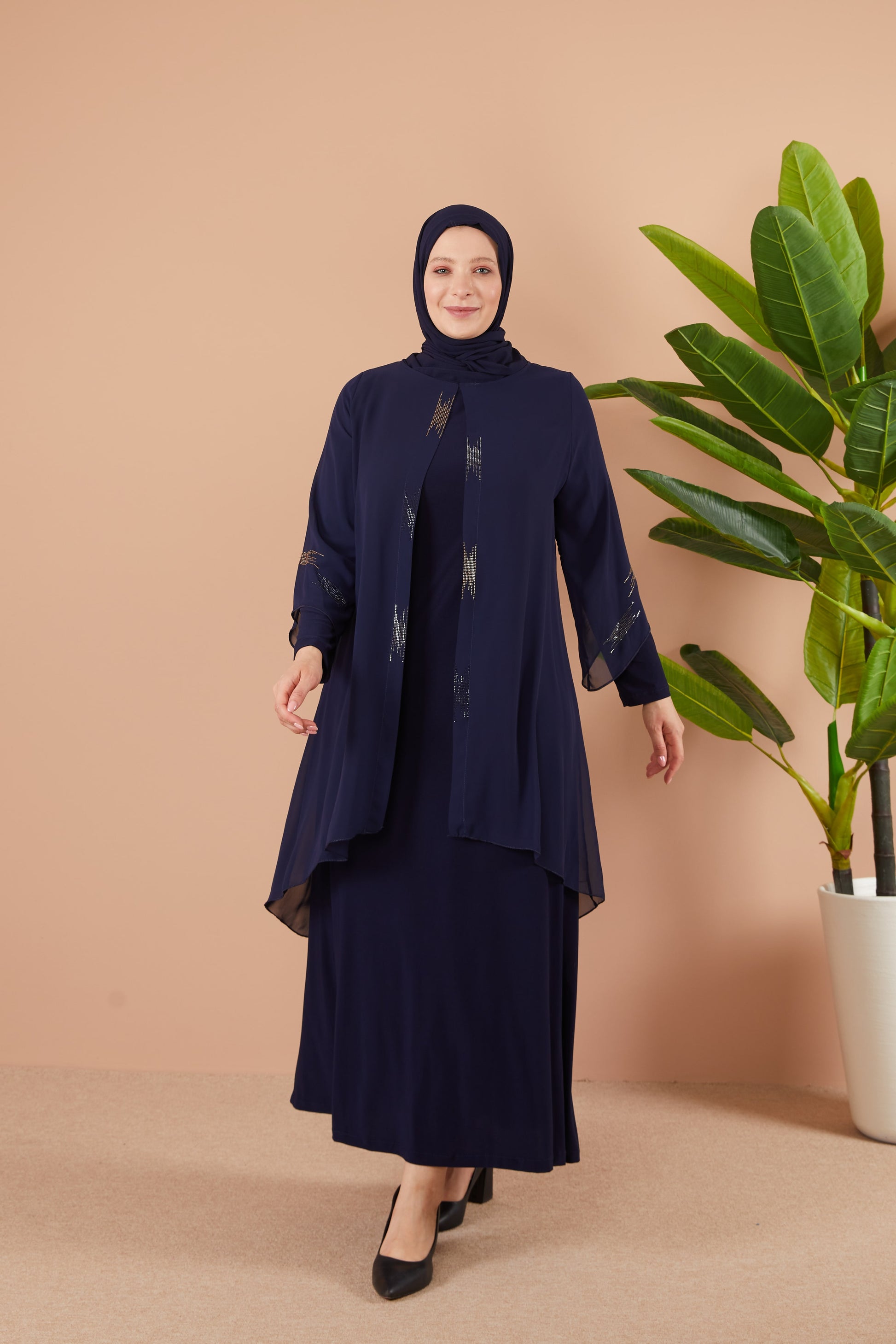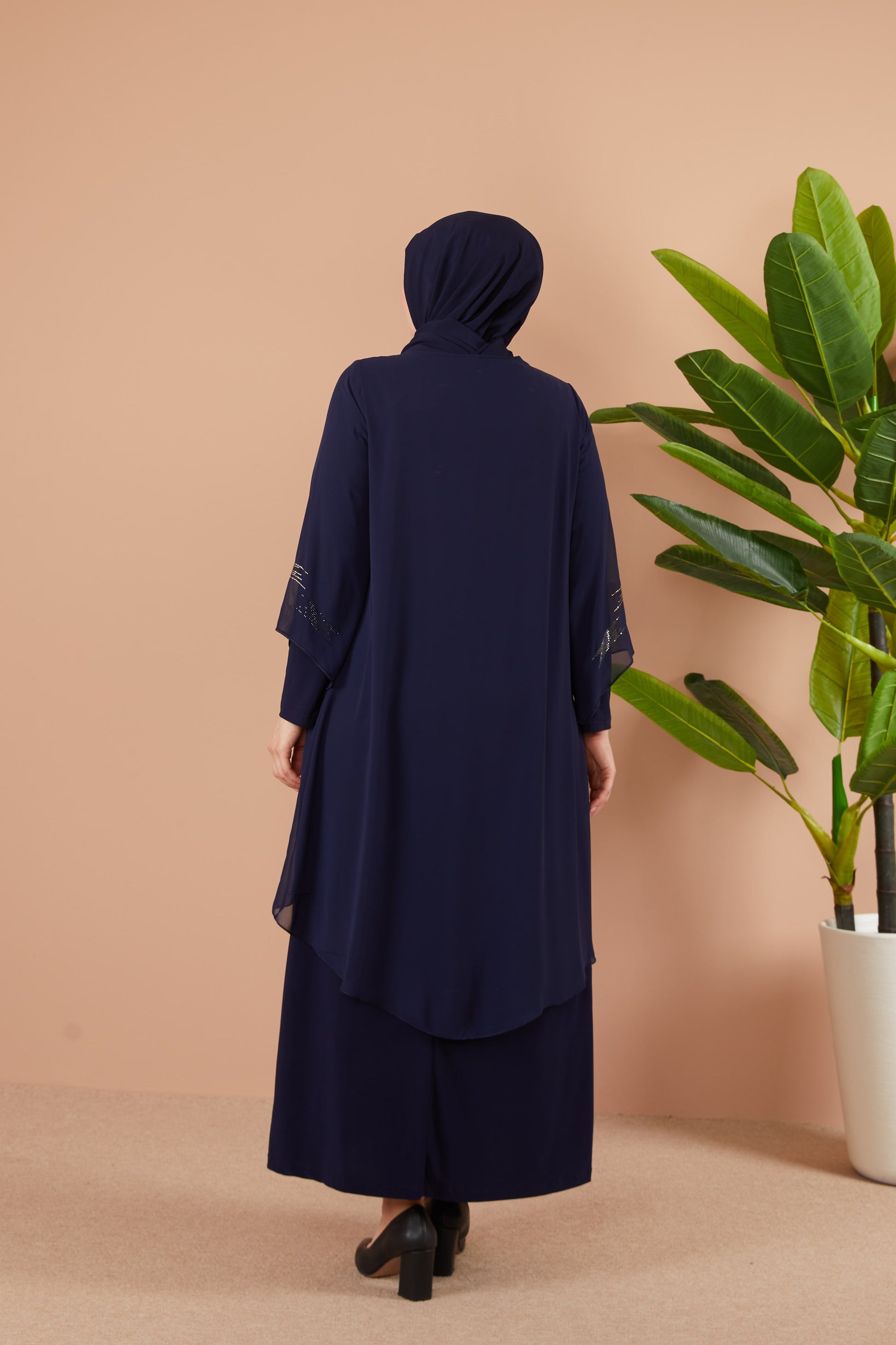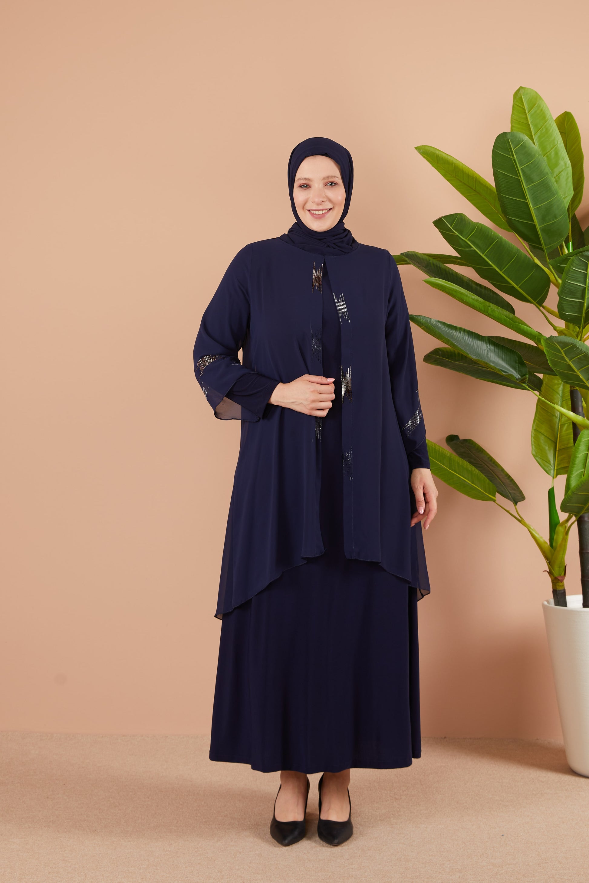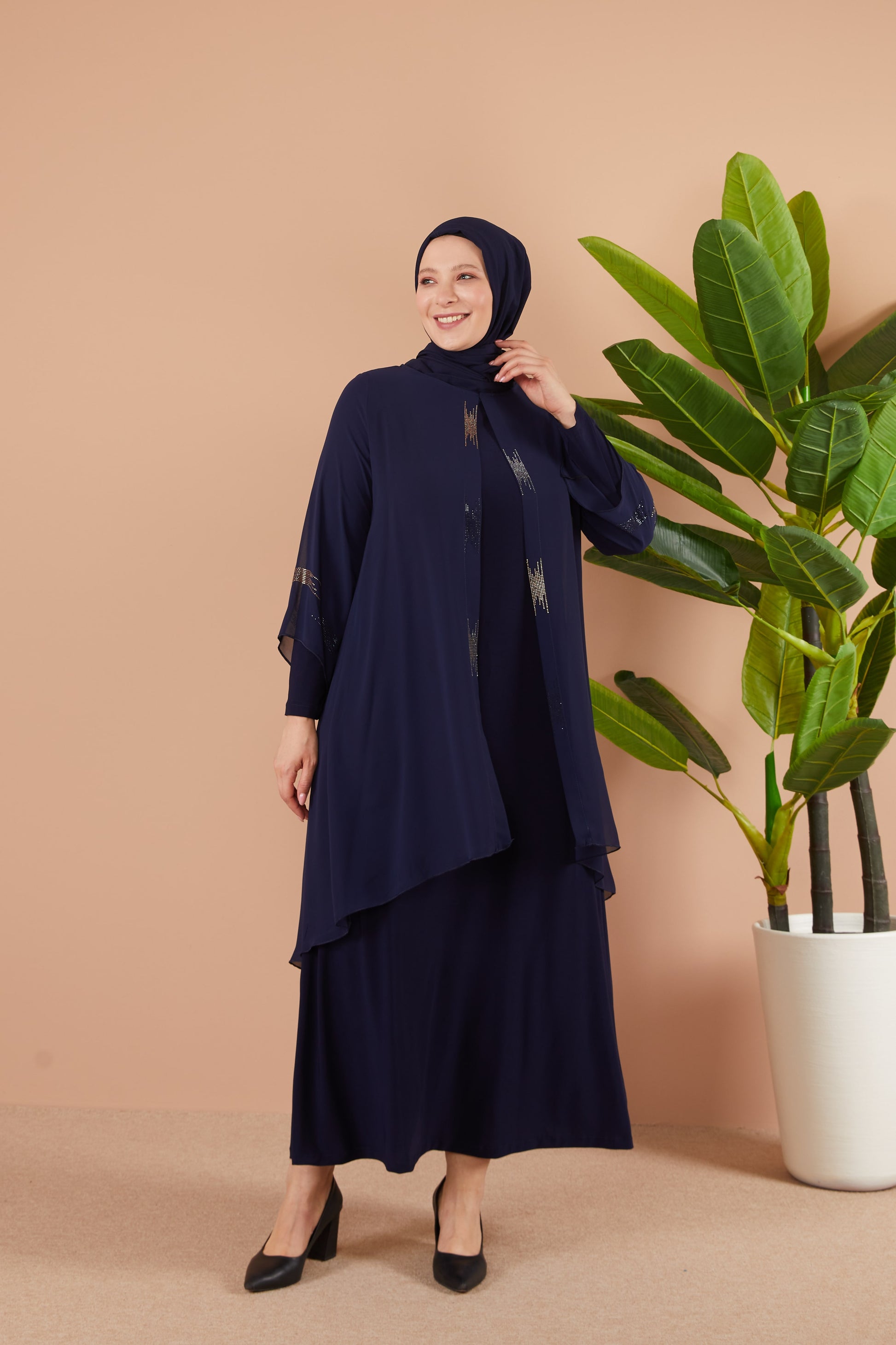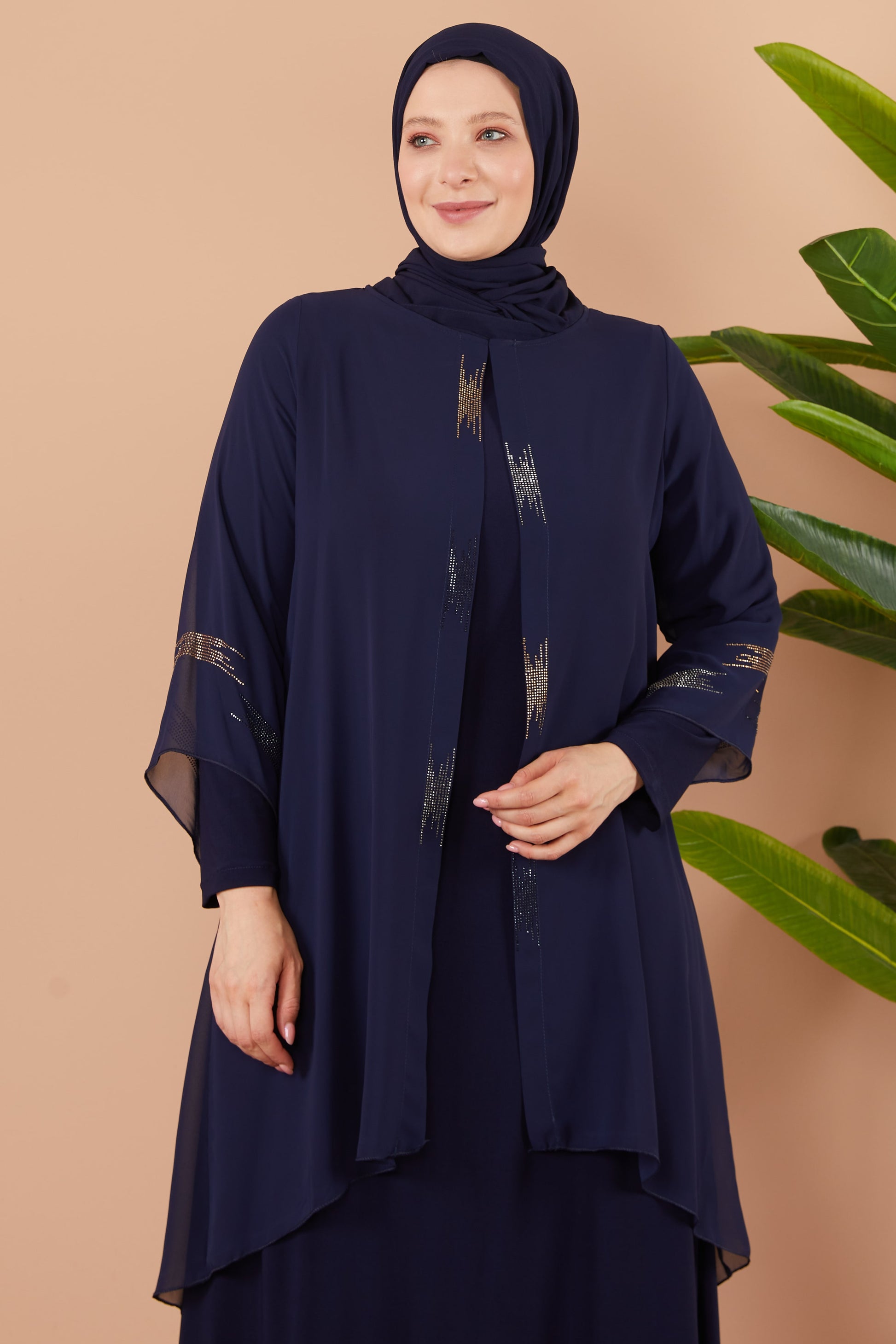 Önü ve Arkası Şifonlu Taş Detaylı Büyük Beden Sendi Elbise Lacivert | 801315