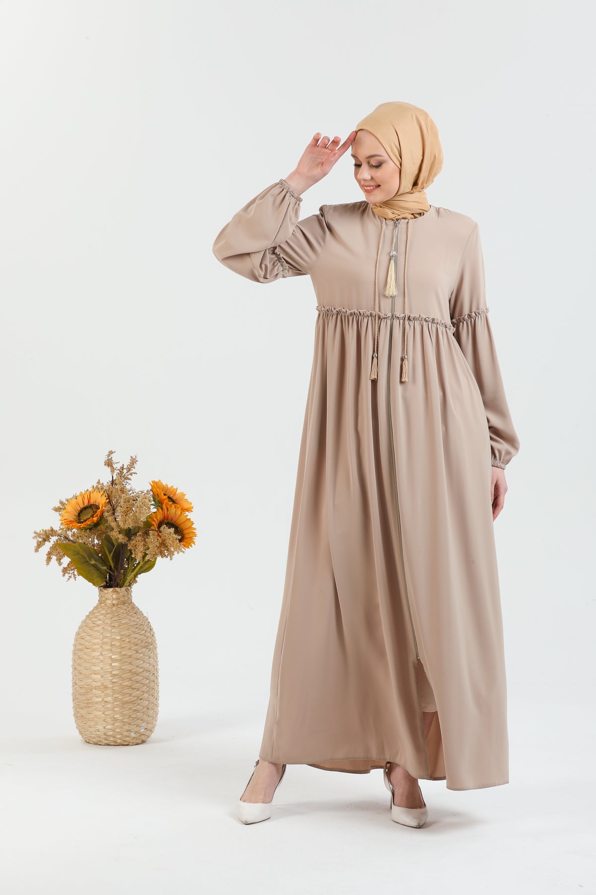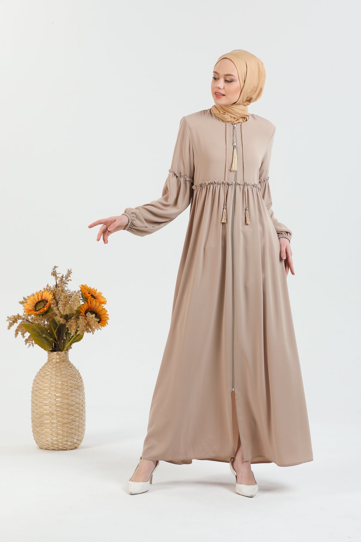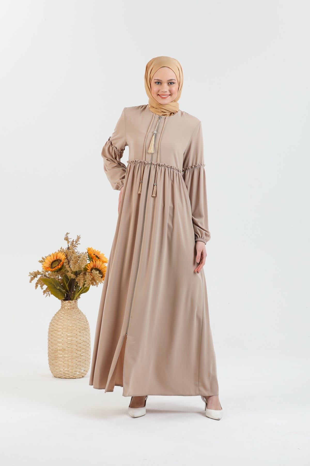 Önü ve Kolu Büzgülü Bileği Lastikli Geniş Kol Ferace Vizon | 206123